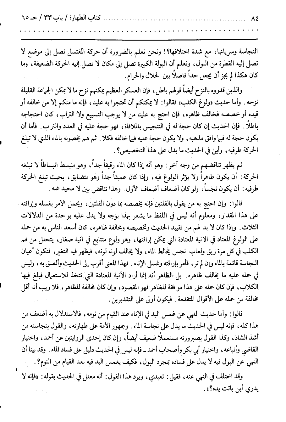 ــــــــــــQالنَّجَاسَة وَسَرَيَانهَا مَعَ شِدَّة اِخْتِلَافهَا وَنَحْنُ نَعْلَم بِالضَّرُورَةِ أَنَّ حَرَكَة الْمُغْتَسِل تَصِل إِلَى مَوْضِعٍ لَا تَصِل إِلَيْهِ الْقَطْرَة مِنْ الْبَوْل وَنَعْلَم أَنَّ الْبَوْلَة الْكَبِيرَة تَصِل إِلَى مَكَان لَا تَصِل إِلَيْهِ الْحَرَكَة الضَّعِيفَة وَمَا كَانَ هَكَذَا لَمْ يَجُزْ أَنْ يُجْعَل حَدًّا فَاصِلًا بَيْن الْحَلَال وَالْحَرَام