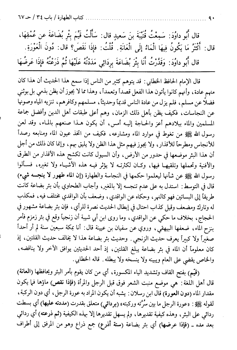قَالَ الْإِمَامُ الْحَافِظُ الْخَطَّابِيُّ قَدْ يَتَوَهَّمُ كَثِيرٌ مِنَ النَّاسِ إِذَا سَمِعَ هَذَا الْحَدِيثَ أَنَّ هَذَا كَانَ مِنْهُمْ عَادَةً وَأَنَّهُمْ كَانُوا يَأْتُونَ هَذَا الْفِعْلَ قَصْدًا وَتَعَمُّدًا وَهَذَا مِمَّا لَا يَجُوزُ أَنْ يُظَنَّ بِذِمِّيٍّ بَلْ بِوَثَنِيٍّ فَضْلًا عَنْ مُسْلِمٍ فَلَمْ يَزَلْ مِنْ عَادَةِ النَّاسِ قَدِيمًا وَحَدِيثًا مُسْلِمِهِمْ وَكَافِرِهِمْ تَنْزِيهُ الْمِيَاهِ وَصَوْنُهَا عَنِ النَّجَاسَاتِ فَكَيْفَ يُظَنُّ بِأَهْلِ ذَلِكَ الزَّمَانِ وَهُمْ أَعْلَى طَبَقَاتِ أَهْلِ الدِّينِ وَأَفْضَلُ جَمَاعَةِ الْمُسْلِمِينَ وَالْمَاءُ بِبِلَادِهِمْ أَعَزُّ وَالْحَاجَةُ إِلَيْهِ أَمَسُّ أَنْ يَكُونَ هَذَا صُنْعُهُمْ بِالْمَاءِ وَقَدْ لَعَنَ رَسُولُ اللَّهِ صَلَّى اللَّهُ عَلَيْهِ وَسَلَّمَ من تَغَوَّطَ فِي مَوَارِدِ الْمَاءِ وَمَشَارِعِهِ فَكَيْفَ مَنِ اتَّخَذَ عُيُونَ الْمَاءِ وَمَنَابِعَهُ رَصَدًا لِلْأَنْجَاسِ وَمَطْرَحًا لِلْأَقْذَارِ وَلَا يَجُوزُ فِيهِمْ مِثْلُ هَذَا الظَّنُّ وَلَا يَلِيقُ بِهِمْ وَإِنَّمَا كَانَ ذَلِكَ مِنْ أَجْلِ أَنَّ هَذَا الْبِئْرَ مَوْضِعُهَا فِي حُدُورٍ مِنَ الْأَرْضِ وَأَنَّ السُّيُولَ كَانَتْ تَكْشَحُ هَذِهِ الْأَقْذَارَ مِنَ الطُّرُقِ وَالْأَفْنِيَةِ وَتَحْمِلُهَا وَتُلْقِيهَا فِيهَا وَكَانَ لِكَثْرَتِهِ لَا يُؤَثِّرُ فِيهِ هَذِهِ الْأَشْيَاءُ وَلَا تُغَيِّرُهُ فَسَأَلُوا رَسُولَ اللَّهِ صَلَّى اللَّهُ عَلَيْهِ وَسَلَّمَ عَنْ شَأْنِهَا لِيَعْلَمُوا حُكْمَهَا فِي النَّجَاسَةِ وَالطَّهَارَةِ (إِنَّ الْمَاءَ طَهُورٌ لَا يُنَجِّسُهُ شَيْءٌ) قَالَ فِي التَّوَسُّطِ اسْتُدِلَّ بِهِ عَلَى عَدَمِ تَنَجُّسِهِ إِلَّا بِالْمُغَيَّرِ وَأَجَابَ الطَّحَاوِيُّ بِأَنَّ بِئْرَ بُضَاعَةَ كَانَتْ طَرِيقًا إِلَى الْبَسَاتِينِ فَهُوَ كَالنَّهَرِ وَحَكَاهُ عَنِ الْوَاقِدِيِّ وَضُعِّفَ بِأَنَّ الْوَاقِدِيَّ مُخْتَلَفٌ فِيهِ فَمُكَذِّبٌ لَهُ وَتَارِكٌ وَمُضَعِّفٌ وَقِيلَ كَذَّابٌ احْتَالَ فِي إِبْطَالِ الْحَدِيثِ نُصْرَةً لِلرَّأْيِ فَإِنَّ بِئْرَ بُضَاعَةَ مَشْهُورٌ فِي الْحُجَّاجِ بِخِلَافِ ما حكي عن الواقدي وما روى بن أَبِي شَيْبَةَ أَنَّ زِنْجِيًّا وَقَعَ فِي بِئْرِ زمزم فأمر بترج الْمَاءِ ضَعَّفَهَا الْبَيْهَقِيُّ وَرَوَى عَنْ سُفْيَانَ بْنِ عُيَيْنَةَ قَالَ أَنَا بِمَكَّةَ سَبْعِينَ سَنَةً لَمْ أَرَ أَحَدًا صَغِيرًا وَلَا كَبِيرًا يَعْرِفُ حَدِيثَ الزِّنْجِيِّ