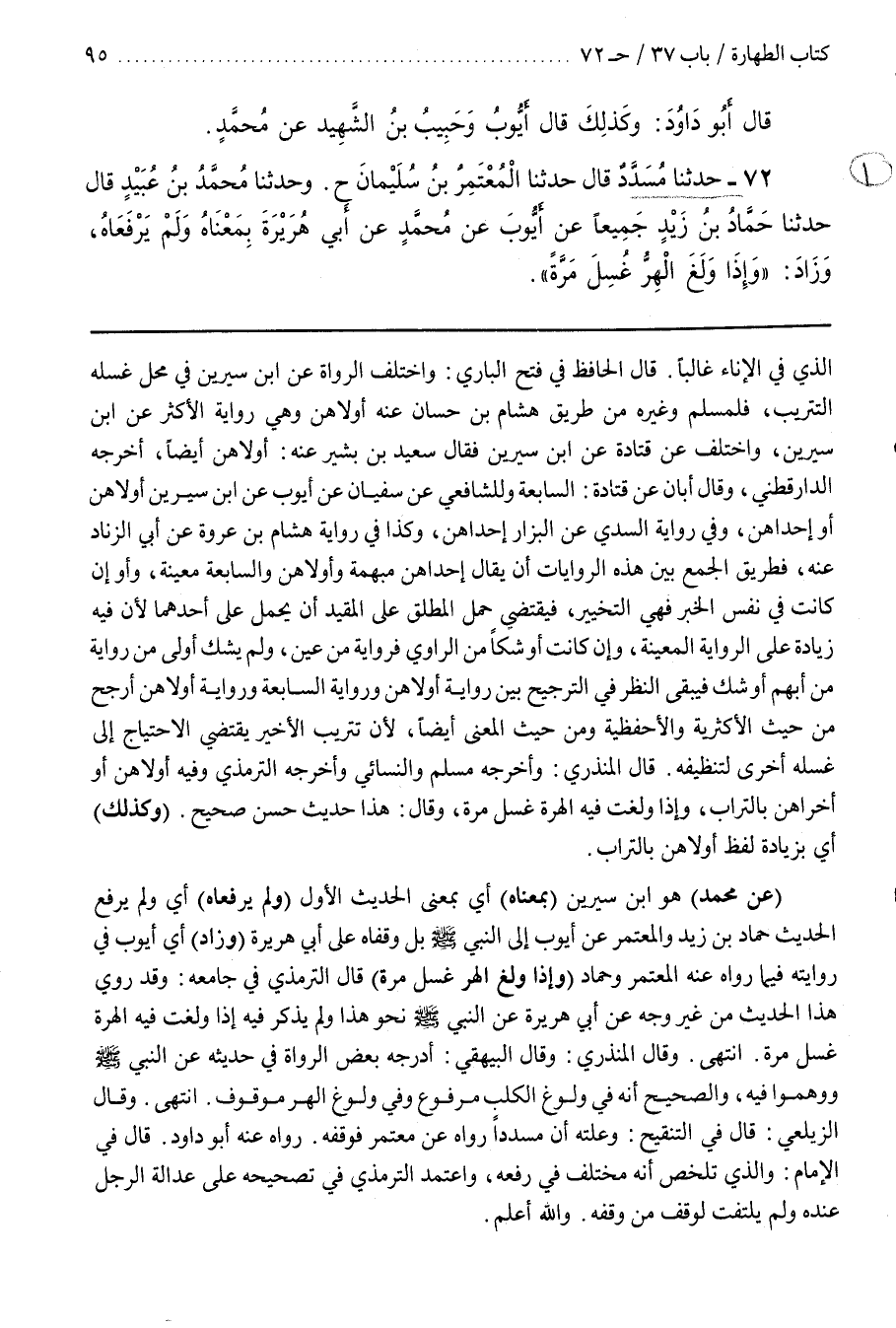 قَالَ الْحَافِظُ فِي فتح الباري واختلف الرواة عن بن سِيرِينَ فِي مَحَلِّ غَسْلَةِ التَّتْرِيبِ فَلِمُسْلِمٍ وَغَيْرِهِ مِنْ طَرِيقِ هِشَامِ بْنِ حَسَّانَ عَنْهُ أُولَاهُنَّ وهي رواية الأكثر عن بن سيرين واختلف عن قتادة عن بن سِيرِينَ فَقَالَ سَعِيدُ بْنُ بَشِيرٍ عَنْهُ أُولَاهُنَّ أَيْضًا أَخْرَجَهُ الدَّارَقُطْنِيُّ وَقَالَ أَبَانُ عَنْ قَتَادَةَ السَّابِعَةُ وَلِلشَّافِعِيِّ عَنْ سُفْيَانَ عَنْ أَيُّوبَ عَنِ بن سِيرِينَ أُولَاهُنَّ أَوْ إِحْدَاهُنَّ وَفِي رِوَايَةِ السُّدِّيِّ عَنِ الْبَزَّارِ إِحْدَاهُنَّ وَكَذَا فِي رِوَايَةِ هِشَامِ بْنِ عُرْوَةَ عَنْ أَبِي الزِّنَادِ عَنْهُ فَطَرِيقُ الْجَمْعِ بَيْنَ هَذِهِ الرِّوَايَاتِ أَنْ يُقَالَ إِحْدَاهُنَّ مُبْهَمَةٌ وَأُولَاهُنَّ وَالسَّابِعَةُ مُعَيَّنَةٌ وَأَوْ إِنْ كَانَتْ في نفس الخبر فهي التخيير فَيَقْتَضِي حَمْلُ الْمُطْلَقِ عَلَى الْمُقَيَّدِ أَنْ يُحْمَلَ عَلَى أَحَدِهِمَا لِأَنَّ فِيهِ زِيَادَةٌ عَلَى الرِّوَايَةِ المعينة وإن كانت أوشكا مِنَ الرَّاوِي فَرِوَايَةُ مَنْ عَيَّنَ وَلَمْ يَشُكَ أولى من رواية من أبهم أوشك فَيَبْقَى النَّظَرُ فِي التَّرْجِيحِ بَيْنَ رِوَايَةِ أُولَاهُنَّ وَرِوَايَةِ السَّابِعَةِ وَرِوَايَةُ أُولَاهُنَّ أَرْجَحُ مِنْ حَيْثُ الْأَكْثَرِيَّةِ وَالْأَحْفَظِيَّةِ وَمِنْ حَيْثُ الْمَعْنَى أَيْضًا لِأَنَّ تَتْرِيبَ الْأَخِيرِ يَقْتَضِي الِاحْتِيَاجَ إِلَى غَسْلِهِ أُخْرَى لِتَنْظِيفِهِ