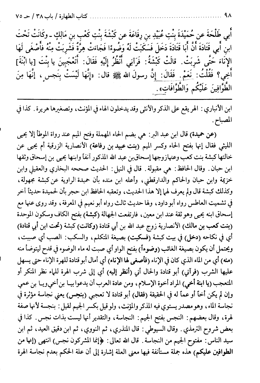قَالَ فِي النيل الحديث صححه البخاري والعقيلي وبن خزيمة وبن حبان والحاكم والدارقطني وأعله بن مَنْدَهْ بِأَنَّ حُمَيْدَةَ الرَّاوِيَةَ عَنْ كَبْشَةَ مَجْهُولَةٌ وَكَذَلِكَ كَبْشَةُ قَالَ وَلَمْ يُعْرَفْ لَهُمَا إِلَّا هذا الحديث وتعقبه الحافظ بن حَجَرٍ بِأَنَّ لِحُمَيْدَةَ حَدِيثًا آخَرَ فِي تَشْمِيتِ الْعَاطِسِ رَوَاهُ أَبُو دَاوُدَ وَلَهَا حَدِيثٌ ثَالِثٌ رَوَاهُ أَبُو نُعَيْمٍ فِي الْمَعْرِفَةِ وَقَدْ رَوَى عنها مع إسحاق ابنه يحيى وهو ثقة عند بن مَعِينٍ فَارْتَفَعَتِ الْجَهَالَةُ (كَبْشَةَ) بِفَتْحِ الْكَافِ وَسُكُونِ الْمُوَحَّدَةِ (بِنْتِ كَعْبٍ بْنِ مَالِكٍ) الْأَنْصَارِيَّةِ زَوْجِ عَبْدِ اللَّهِ بْنِ أَبِي قَتَادَةَ (وَكَانَتْ) كَبْشَةُ (تحت بن أَبِي قَتَادَةَ) أَيْ فِي نِكَاحِهِ (دَخَلَ) فِي بَيْتِ كَبْشَةَ (فَسَكَبْتُ) بِصِيغَةِ الْمُتَكَلِّمِ وَالسَّكْبُ الصَّبُّ أَيْ صَبَبْتُ وَيَحْتَمِلُ أَنْ يَكُونَ بِصِيغَةِ الْغَائِبِ (وَضُوءًا) بِفَتْحِ الْوَاوِ أَيْ صَبَّتْ لَهُ مَاءَ الْوُضُوءِ فِي قَدَحٍ لِيَتَوَضَّأَ مِنْهُ (مِنْهُ) أَيْ مِنَ الْمَاءِ الَّذِي كَانَ فِي الْإِنَاءِ (فَأَصْغَى لَهَا الْإِنَاءَ) أَيْ أَمَالَ أَبُو قَتَادَةَ لِلْهِرَّةِ الْإِنَاءَ حَتَّى يَسْهُلَ عَلَيْهَا الشُّرْبُ (فَرَآنِي) أَبُو قَتَادَةَ وَالْحَالُ أَنِّي (أَنْظُرُ إِلَيْهِ) أَيْ إِلَى شُرْبِ الْهِرَّةِ لِلْمَاءِ نَظَرَ الْمُنْكِرِ أَوِ الْمُتَعَجِّبِ (يَا ابْنَةَ أَخِي) الْمُرَادُ أُخُوَّةُ الْإِسْلَامِ وَمِنْ عادة العرب أن يدعوا بيا بن أخي ويا بن عَمِّي وَإِنْ لَمْ يَكُنْ أَخًا أَوْ عَمًّا لَهُ فِي الْحَقِيقَةِ (فَقَالَ) أَبُو قَتَادَةَ لَا تَعْجَبِي (بِنَجَسٍ) يَعْنِي نَجَاسَةً مُؤَثِّرَةً فِي نَجَاسَةِ الْمَاءِ وَهُوَ مَصْدَرٌ يَسْتَوِي فِيهِ الْمُذَكَّرُ وَالْمُؤَنَّثُ وَلَوْ قِيلَ بِكَسْرِ الْجِيمِ لَقِيلَ بِنَجِسَةٍ لِأَنَّهَا صِفَةٌ لِهِرَّةٍ وَقَالَ بَعْضُهُمُ النَّجَسُ بِفَتْحِ الْجِيمِ النَّجَاسَةُ وَالتَّقْدِيرُ أَنَّهَا لَيْسَتْ بِذَاتِ نَجَسٍ