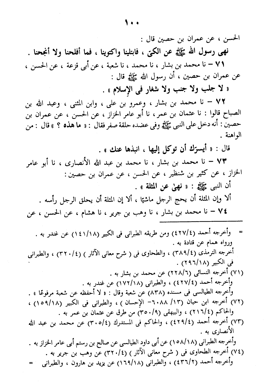 73 - نا مُحَمَّدُ بْنُ بَشَّارٍ، نا مُحَمَّدُ بْنُ عَبْدِ اللَّهِ الْأَنْصَارِيُّ، نا أَبُو عَامِرٍ الْخَزَّازُ، عَنْ كَثِيرِ بْنِ شِنْظِيرٍ، عَنِ الْحَسَنِ، عَنْ عِمْرَانَ بْنِ حُصَيْنٍ: أَنَّ النَّبِيَّ صَلَّى اللهُ عَلَيْهِ وَسَلَّمَ «§نَهَى عَنِ الْمُثْلَةِ» أَلَا وَإِنَّ الْمُثْلَةَ أَنْ يَحُجَّ الرَّجُلُ مَاشِيًا، أَلَا إنَّ الْمُثْلَةَ أَنْ يَحْلِقَ الرَّجُلُ رَأْسَهُ "