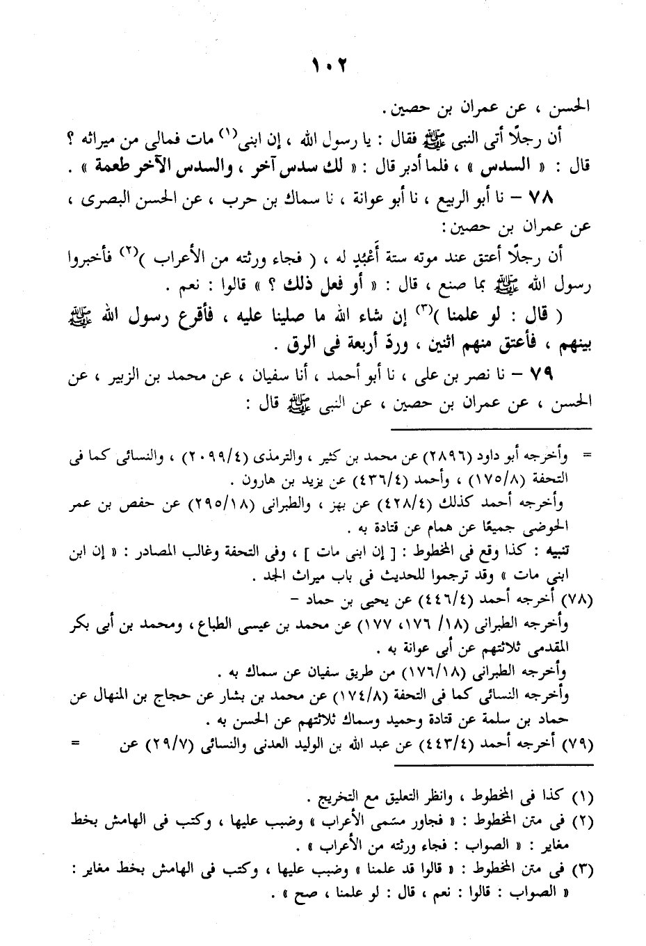 78 - نا أَبُو الرَّبِيعِ، نا أَبُو عَوَانَةَ، نا سِمَاكُ بْنُ حَرْبٍ، عَنِ الْحَسَنِ الْبَصْرِيِّ، عَنْ عِمْرَانَ بْنِ حُصَيْنٍ: أَنَّ رَجُلًا أَعْتَقَ عِنْدَ مَوْتِهِ سِتَّةَ أَعْبُدٍ لَهُ، فَجَاءَ وَرَثَتُهُ مِنَ الْأَعْرَابِ فَأَخْبَرُوا رَسُولَ اللَّهِ صَلَّى اللهُ عَلَيْهِ وَسَلَّمَ بِمَا صَنَعَ قَالَ: «أَوَ فَعَلَ ذَلِكَ؟» قَالُوا: نَعَمْ، قَالَ: «§لَوْ عَلِمْنَا إنْ شَاءَ اللَّهُ مَا صَلَّيْنَا عَلَيْهِ» فَأَقْرَعَ رَسُولُ اللَّهِ صَلَّى اللهُ عَلَيْهِ وَسَلَّمَ بَيْنَهُمْ فَأَعْتَقَ مِنْهُمُ اثْنَيْنِ وَرَدَّ أَرْبَعَةً فِي الرِّقِّ "