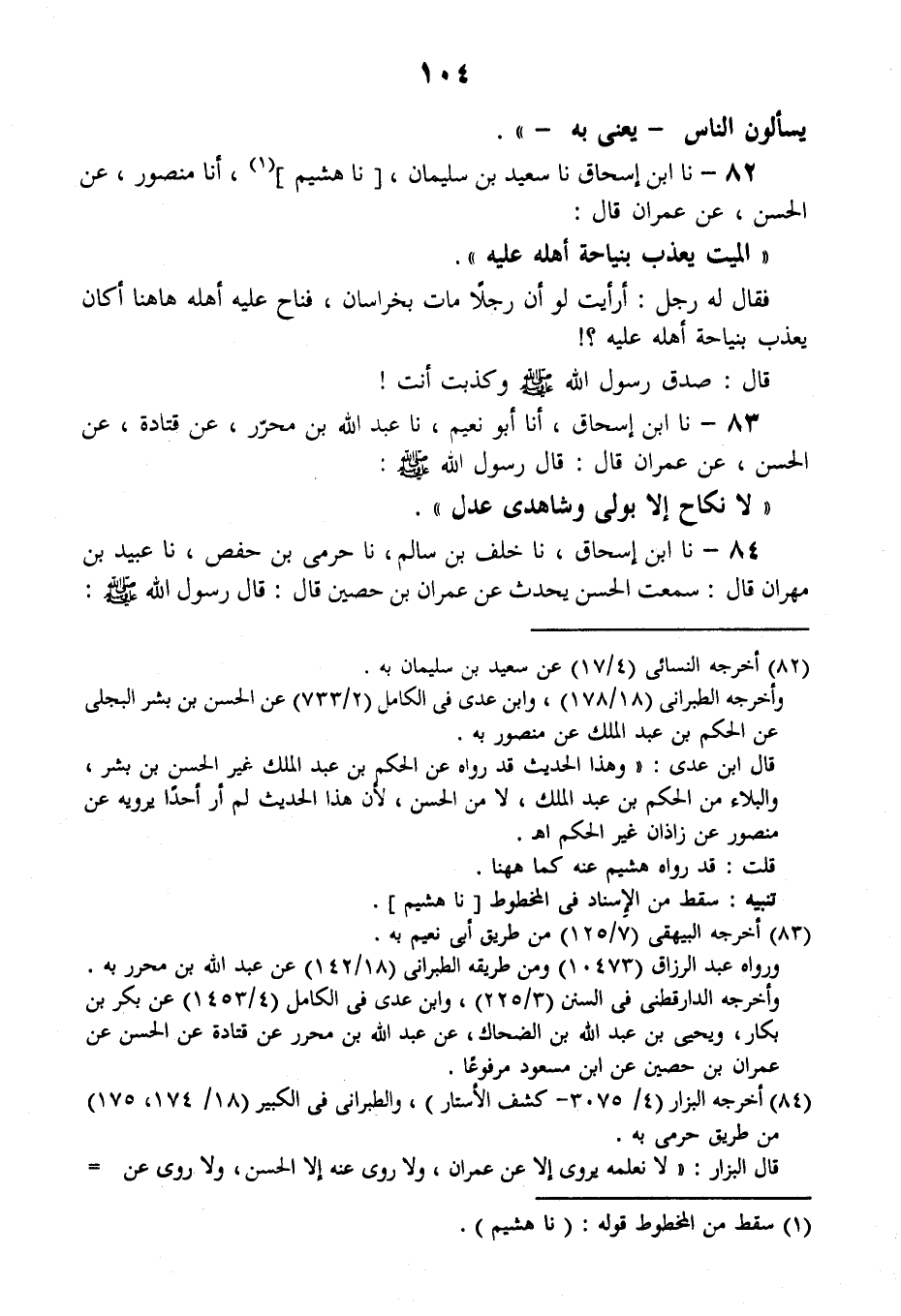 82 - نا ابْنُ إِسْحَاقَ، نا سَعِيدُ بْنُ سُلَيْمَانَ، نا هُشَيْمٌ، أنا مَنْصُورٌ، عَنِ الْحَسَنِ، عَنْ عِمْرَانَ قَالَ: «§الْمَيِّتُ يُعَذَّبُ بِنِيَاحَةِ أَهْلِهِ عَلَيْهِ» فَقَالَ لَهُ رَجُلٌ: أَرَأَيْتَ لَوْ أَنَّ رَجُلًا مَاتَ بِخُرَاسَانَ فَنَاحَ عَلَيْهِ أَهْلُهُ هَاهُنَا، أَكَانَ يُعَذَّبُ بِنِيَاحَةِ أَهْلِهِ عَلَيْهِ؟ قَالَ: صَدَقَ رَسُولُ اللَّهِ صَلَّى اللهُ عَلَيْهِ وَسَلَّمَ وَكَذَبْتَ أَنْتَ "