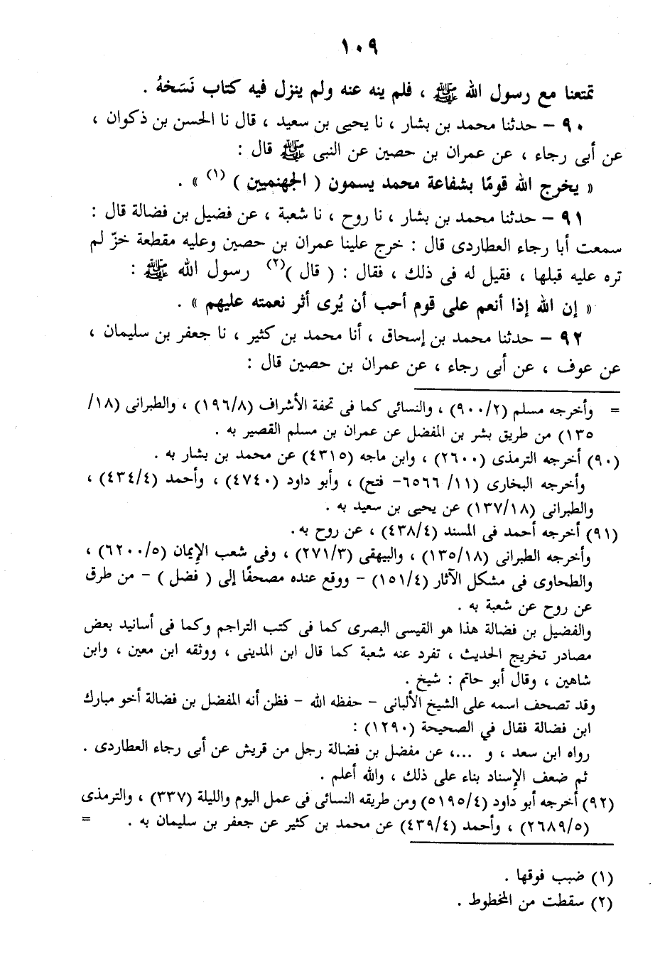 91 - حَدَّثَنَا مُحَمَّدُ بْنُ بَشَّارٍ، نا رَوْحُ، نا شُعْبَةُ، عَنْ فُضَيْلِ بْنِ فَضَالَةَ قَالَ: سَمِعْتُ أَبَا رَجَاءٍ الْعُطَارِدِيَّ قَالَ: خَرَجَ عَلَيْنَا عِمْرَانُ بْنُ حُصَيْنٍ وَعَلَيْهِ مُقَطَّعَةُ خَزٍّ لَمْ تُرَ عَلَيْهِ قَبْلَهَا، فَقِيلَ لَهُ فِي ذَلِكَ فَقَالَ: قَالَ: رَسُولُ اللَّهِ صَلَّى اللهُ عَلَيْهِ وَسَلَّمَ: «§إنَّ اللَّهَ إِذَا أَنْعَمَ عَلَى قَوْمٍ أَحَبَّ أَنْ يَرَى أَثَرَ نِعْمَتِهِ عَلَيْهِمْ»