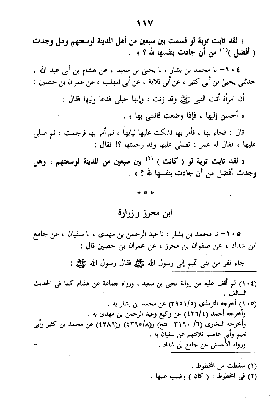 104 - نا مُحَمَّدُ بْنُ بَشَّارٍ، نا يَحْيَى بْنُ سَعِيدٍ، عَنْ هِشَامِ بْنِ أَبِي عَبْدِ اللَّهِ، حَدَّثَنِي يَحْيَى بْنُ أَبِي كَثِيرٍ، عَنْ أَبِي قِلَابَةَ، عَنْ أَبِي الْمُهَلَّبِ، عَنْ عِمْرَانَ بْنِ حُصَيْنٍ: أَنَّ امْرَأَةً أَتَتِ النَّبِيَّ صَلَّى اللهُ عَلَيْهِ وَسَلَّمَ وَقَدْ زَنَتْ، وَإِنَّهَا حُبْلَى، فَدَعَا وَلِيَّهَا فَقَالَ: أَحْسِنْ إلِيهَا، فَإِذَا وَضَعَتْ فَائْتِنِي بِهَا، قَالَ: فَجَاءَ بِهَا فَأَمَرَ بِهَا، فَشَكَتْ عَلَيْهَا ثِيَابَهَا، ثُمَّ أَمَرَ بِهَا فَرُجِمَتْ، ثُمَّ صَلَّى عَلَيْهَا، فَقَالَ لَهُ عُمَرُ: تُصَلِّي عَلَيْهَا وَقَدْ رَجَمْتَهَا؟ فَقَالَ: «§لَقَدْ تَابَتْ تَوْبَةً لَوْ كَانَتْ بَيْنَ سَبْعِينَ مِنَ الْمَدِينَةِ لَوَسِعَتْهُمْ، وَهَلْ وَجَدْتَ أَفْضَلَ مِنْ أَنْ جَادَتْ بِنَفْسِهَا لِلَّهِ؟»