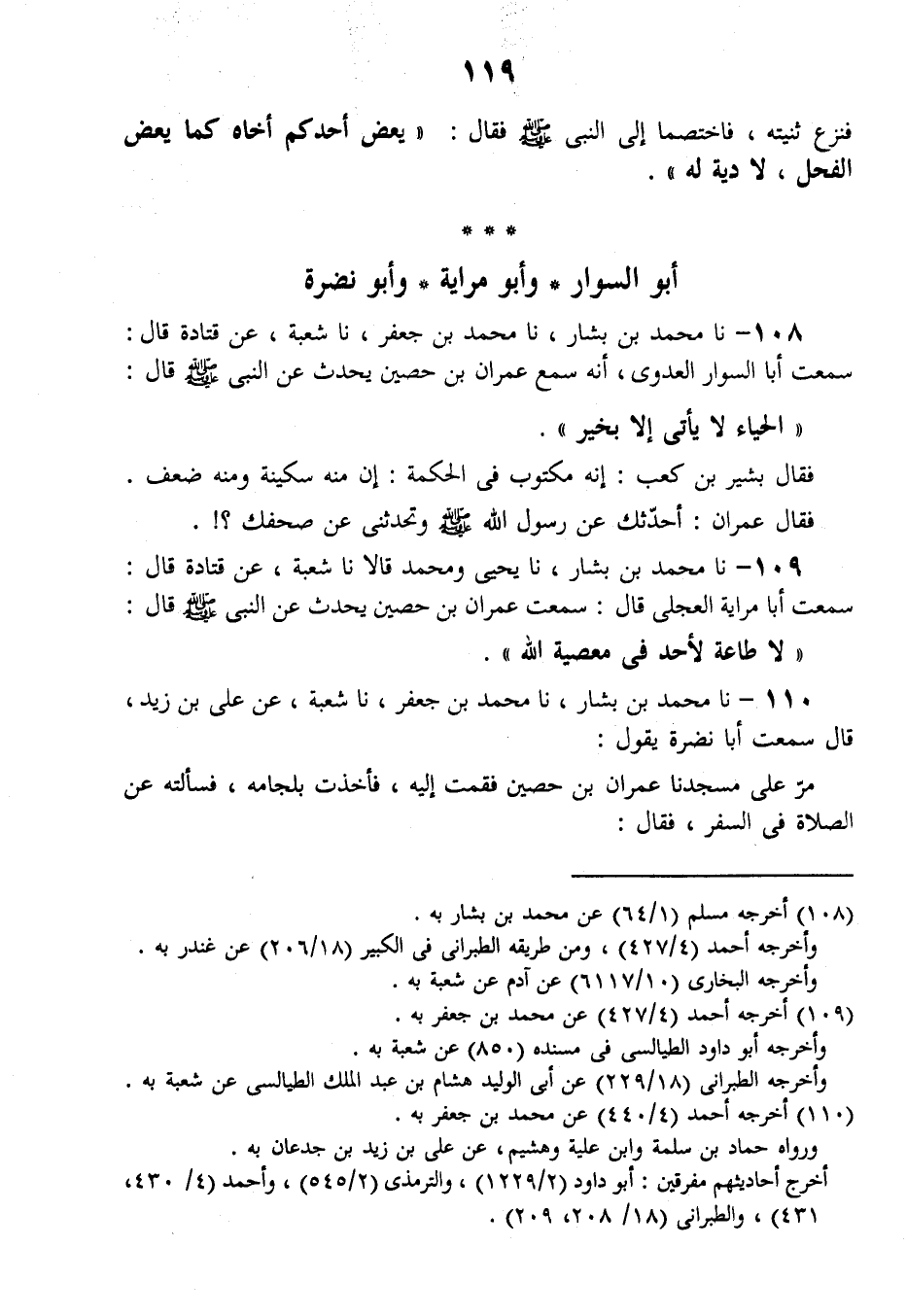 109 - نا مُحَمَّدُ بْنُ بَشَّارٍ، نا يَحْيَى وَمُحَمَّدٌ قَالَا: نا شُعْبَةُ، عَنْ قَتَادَةَ قَالَ: سَمِعْتُ أَبَا مِرَايَةَ الْعِجْلِيَّ، قَالَ: سَمِعْتُ عِمْرَانَ بْنَ حُصَيْنٍ، يُحَدِّثُ عَنِ النَّبِيِّ صَلَّى اللهُ عَلَيْهِ وَسَلَّمَ قَالَ: «§لَا طَاعَةَ لِأَحَدٍ فِي مَعْصِيَةِ اللَّهِ»