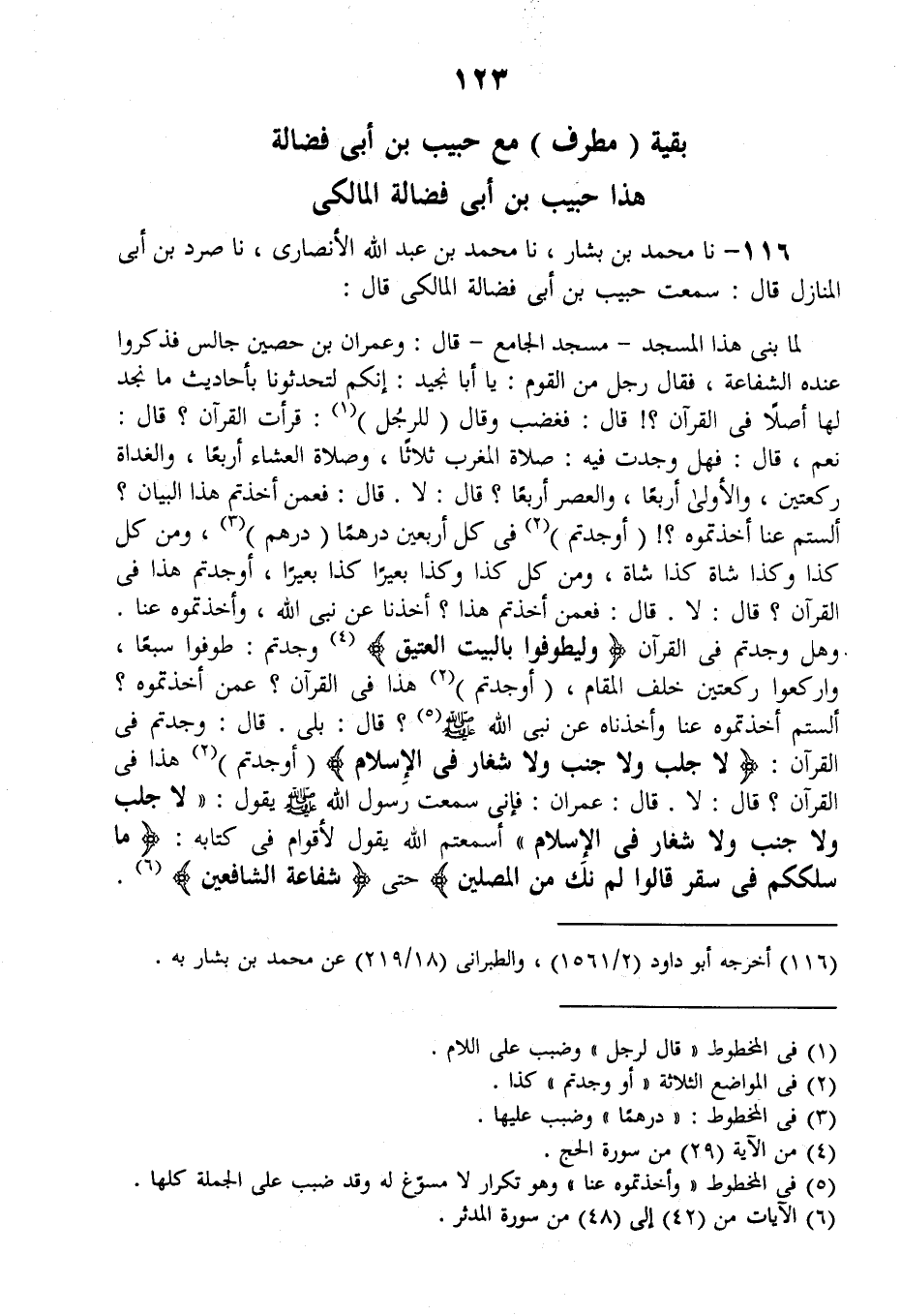 116 - نا مُحَمَّدُ بْنُ بَشَّارٍ، نا مُحَمَّدُ بْنُ عَبْدِ اللَّهِ الْأَنْصَارِيُّ، نا صُرَدُ بْنُ أَبِي الْمَنَازِلِ، قَالَ: سَمِعْتُ حَبِيبَ بْنَ أَبِي فَضَالَةَ الْمَالِكِيَّ قَالَ: لَمَّا بُنِيَ هَذَا الْمَسْجِدُ - مَسْجِدُ الْجَامِعُ - قَالَ: وَعِمْرَانُ بْنُ حُصَيْنٍ جَالِسٌ فَذَكَرُوا عِنْدَهُ الشَّفَاعَةَ، فَقَالَ رَجُلٌ مِنَ الْقَوْمِ: يَا أَبَا نُجَيْدٍ إِنَّكُمْ لَتُحَدِّثُونَا بِأَحَادِيثَ مَا نَجْدُ لَهَا أَصْلًا فِي الْقُرْآنِ؟ قَالَ: فَغَضِبَ وَقَالَ لِلرَّجُلِ: قَرَأْتَ الْقُرْآنَ؟ قَالَ: نَعَمْ، قَالَ: فَهَلْ وَجَدْتَ فِيهِ صَلَاةَ الْمَغْرِبِ ثَلَاثًا، وَصَلَاةَ الْعِشَاءِ أَرْبَعًا، وَالْغَدَاةَ رَكْعَتَيْنِ، وَالْأُولَى أَرْبَعًا، وَالْعَصْرَ أَرْبَعًا؟ قَالَ: لَا، قَالَ: فَعَمَّنْ أَخَذْتُمْ هَذَا الْبَيَانَ؟ أَلَسْتُمْ عَنَّا أَخَذْتُمُوهُ؟ أَوَجَدْتُمْ: فِي كُلِّ أَرْبَعِينَ دِرْهَمًا دِرْهَمًا، وَمِنْ كُلِّ كَذَا وَكَذَا شَاةً كَذَا شَاةً، وَمِنْ كُلِّ كَذَا وَكَذَا بَعِيرًا كَذَا بَعِيرًا، أَوَجَدْتُمْ هَذَا فِي الْقُرْآنِ؟ قَالَ: لَا، قَالَ: فَعَمَّنْ أَخَذْتُمْ هَذَا؟ أَخَذْنَا عَنْ نَبِيِّ اللَّهِ وَأَخَذْتُمُوهُ عَنَّا، وَهَلْ وَجَدْتُمْ فِي الْقُرْآنِ {وَلْيَطَّوَّفُوا بِالْبَيْتِ الْعَتِيقِ} [الحج: 29] وَجَدْتُمْ طُوفُوا سَبْعًا وَارْكَعُوا رَكْعَتَيْنِ خَلْفَ الْمَقَامِ؟ أَوَجَدتُمْ هَذَا فِي الْقُرْآنِ؟ عَمَّنْ أَخَذْتُمُوهُ؟ أَلَسْتُمْ أَخَذْتُمُوهُ عَنَّا وأَخَذْنَاهُ عَنْ نَبِيِّ اللَّهِ صَلَّى اللهُ عَلَيْهِ وَسَلَّمَ؟ قَالَ: بَلَى، قَالَ: وَجَدْتُمْ فِي الْقُرْآنِ «لَا جَلَبَ وَلَا جَنَبَ وَلَا شِغَارَ فِي الْإِسْلَامِ» أَوَجَدْتُمْ هَذَا فِي الْقُرْآنِ؟ قَالَ: لَا، قَالَ عِمْرَانُ: فَإِنِّي سَمِعْتُ رَسُولَ اللَّهِ صَلَّى اللهُ عَلَيْهِ وَسَلَّمَ يَقُولُ: «§لَا جَلَبَ وَلَا جَنَبَ وَلَا شِغَارَ فِي الْإِسْلَامِ» أَسَمِعْتُمُ اللَّهَ يَقُولُ لِأَقْوَامٍ فِي كِتَابِهِ {مَا سَلَكَكُمْ فِي سَقَرَ قَالُوا لَمْ نَكُ مِنَ الْمُصَلِّينَ} [المدثر: 43] حَتَّى {شَفَاعَةُ الشَّافِعِينَ} [المدثر: 48]