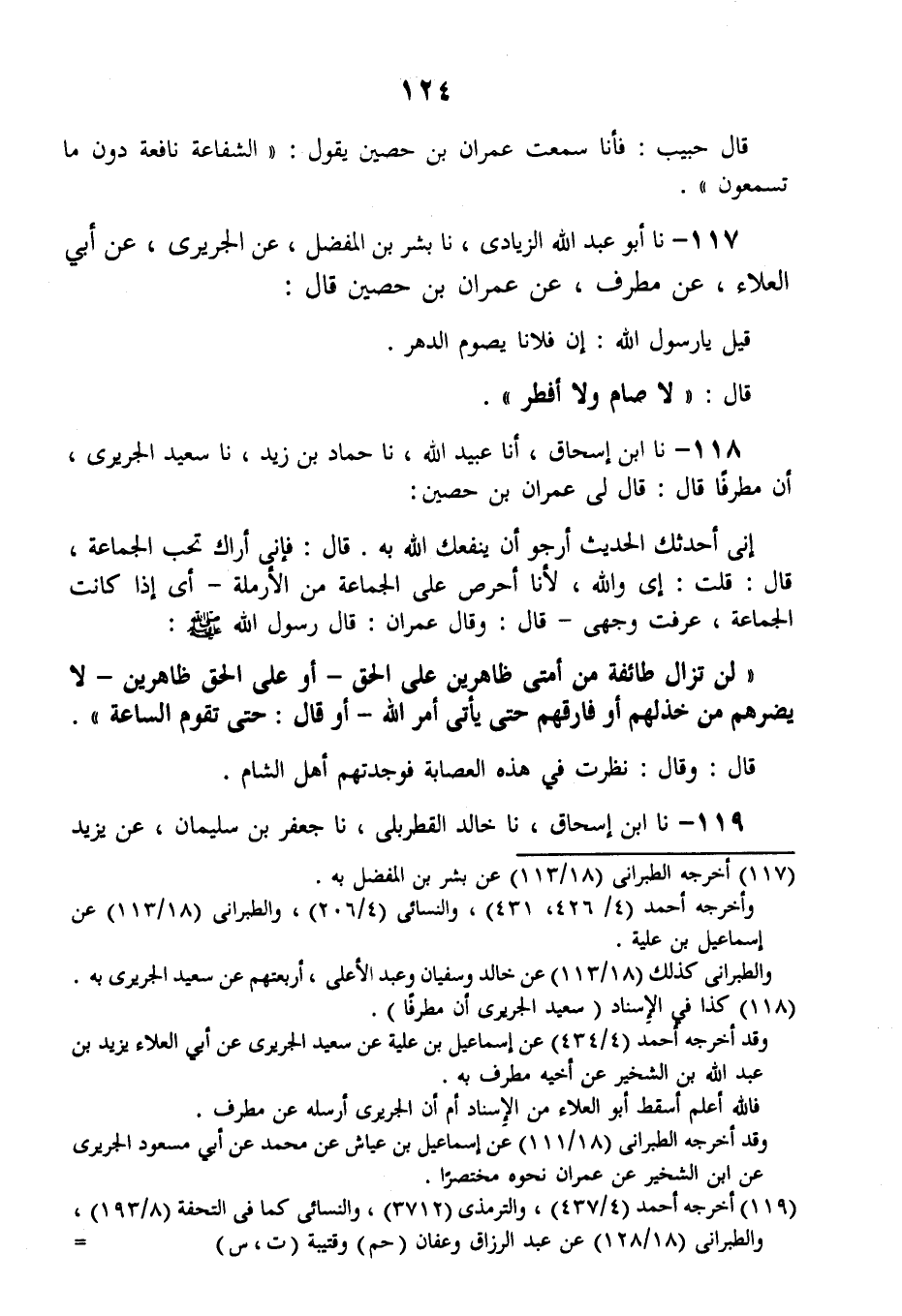 118 - نا ابْنُ إِسْحَاقَ، أنا عَبَيْدُ اللَّهِ، نا حَمَّادُ بْنُ زَيْدٍ، نا سَعِيدٌ الْجُرَيْرِيُّ أَنَّ مُطَرِّفًا قَالَ: قَالَ لِي عِمْرَانُ بْنُ حُصَيْنٍ: إِنِّي أُحَدِّثُكَ الْحَدِيثَ أَرْجُو أَنْ يَنْفَعَكَ اللَّهُ بِهِ، قَالَ: فَإِنِّي أَرَاكَ تُحِبُّ الْجَمَاعَةَ، قَالَ: قُلْتُ: إِي وَاللَّهِ، لَأَنَا أَحْرَصُ عَلَى الْجَمَاعَةِ مِنَ الْأَرْمَلَةِ - أَيْ إِذَا كَانَتِ الْجَمَاعَةُ، عَرَفْتَ وَجْهِي - قَالَ: وَقَالَ عِمْرَانُ: قَالَ رَسُولُ اللَّهِ صَلَّى اللهُ عَلَيْهِ وَسَلَّمَ: " §لَنْ تَزَالَ طَائِفَةٌ مِنْ أُمَّتِي ظَاهِرِينَ عَلَى الْحَقِّ - أَوْ عَلَى الْحَقِّ ظَاهِرِينَ - لَا يَضُرُّهُمْ مَنْ خَذَلَهُمْ - أَوْ فَارَقَهُمْ - حَتَّى يَأْتِيَ أَمْرُ اللَّهِ - أَوْ قَالَ: حَتَّى تَقُومَ السَّاعَةُ " قَالَ: وَقَالَ: نَظَرْتُ فِي هَذِهِ الْعِصَابَةِ فَوَجَدْتُهُمْ أَهْلَ الشَّامِ "