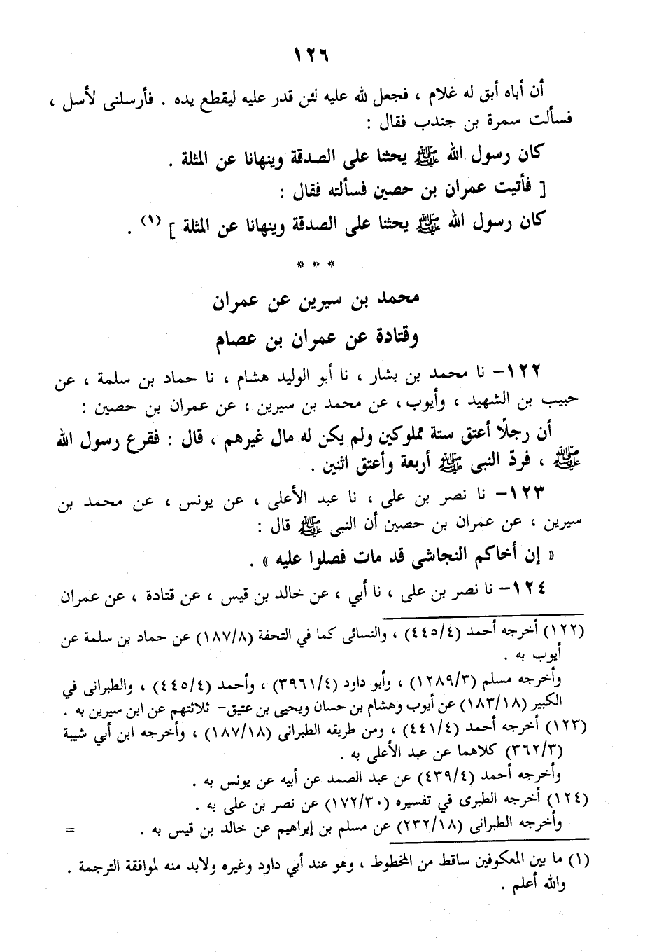 122 - نا مُحَمَّدُ بْنُ بَشَّارٍ، نا أَبُو الْوَلِيدِ هِشَامٌ، نا حَمَّادُ بْنُ سَلَمَةَ، عَنْ حَبِيبِ بْنِ الشَّهِيدِ، وَأَيُّوبُ، عَنْ مُحَمَّدِ بْنِ سِيرِينَ، عَنْ عِمْرَانَ بْنِ حُصَيْنٍ: أَنَّ رَجُلًا أَعْتَقَ سِتَّةً مَمْلُوكِينَ وَلَمْ يَكُنْ لَهُ مَالٌ غَيْرُهُمْ، قَالَ: §فَقَرَعَ رَسُولُ اللَّهِ صَلَّى اللهُ عَلَيْهِ وَسَلَّمَ فَرَدَّ النَّبِيُّ صَلَّى اللهُ عَلَيْهِ وَسَلَّمَ أَرْبَعَةً وَأَعْتَقَ اثْنَيْنِ "