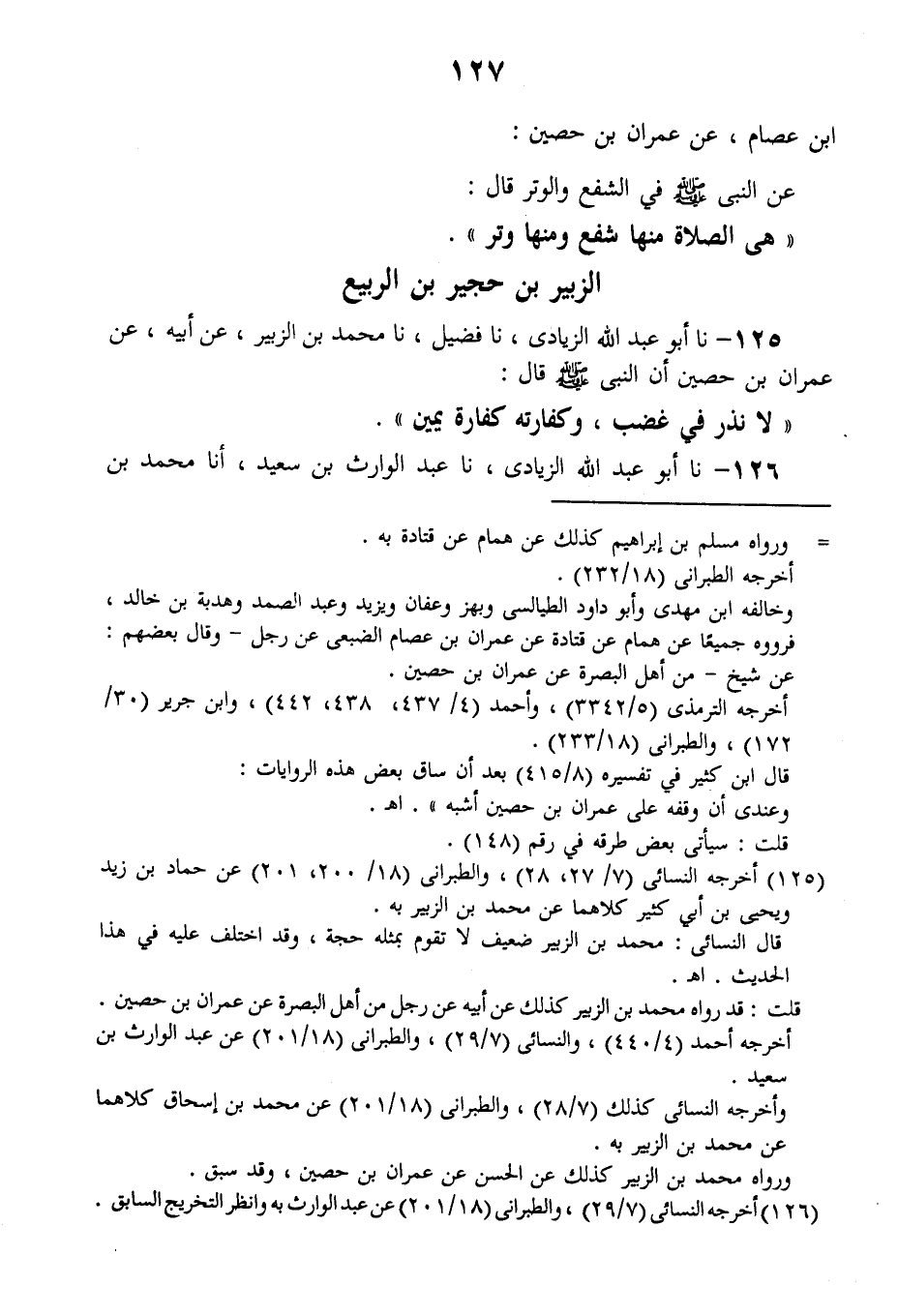 125 - نا أَبُو عَبْدِ اللَّهِ الزِّيَادِيُّ، نا فُضَيْلُ، نا مُحَمَّدُ بْنُ الزُّبَيْرِ، عَنْ أَبِيهِ، عَنْ عِمْرَانَ بْنِ حُصَيْنٍ: أَنَّ النَّبِيَّ صَلَّى اللهُ عَلَيْهِ وَسَلَّمَ قَالَ: «§لَا نَذْرَ فِي غَضِبٍ، وَكَفَّارَتُهُ كَفَّارَةُ يَمِينٍ»