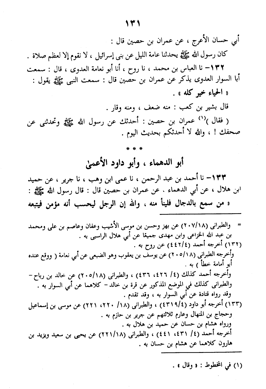 132 - نا الْعَبَّاسُ بْنُ مُحَمَّدٍ، نا رَوْحٌ، أنا أَبُو نَعَامَةَ الْعَدَوِيُّ قَالَ: سَمِعْتُ أَبَا السَّوَّارِ الْعَدَوِيَّ يَذْكُرُ عَنْ عِمْرَانَ بْنِ حُصَيْنٍ قَالَ: سَمِعْتُ النَّبِيَّ صَلَّى اللهُ عَلَيْهِ وَسَلَّمَ يَقُولُ: «§الْحَيَاءُ خَيْرٌ كُلُّهُ» قَالَ بَشِيرُ بْنُ كَعْبٍ: مِنْهُ ضِعْفٌ وَمِنْهُ وَقَارٌ، فَقَالَ عِمْرَانُ بْنُ حُصَيْنٍ: أُحَدِّثُكَ عَنْ رَسُولِ اللَّهِ صَلَّى اللهُ عَلَيْهِ وَسَلَّمَ َوَتُحَدِّثُنِي عَنْ صُحُفِكَ، وَاللَّهِ لَا أُحَدِّثُكُمْ بِحَدِيثٍ الْيَوْمَ " 7