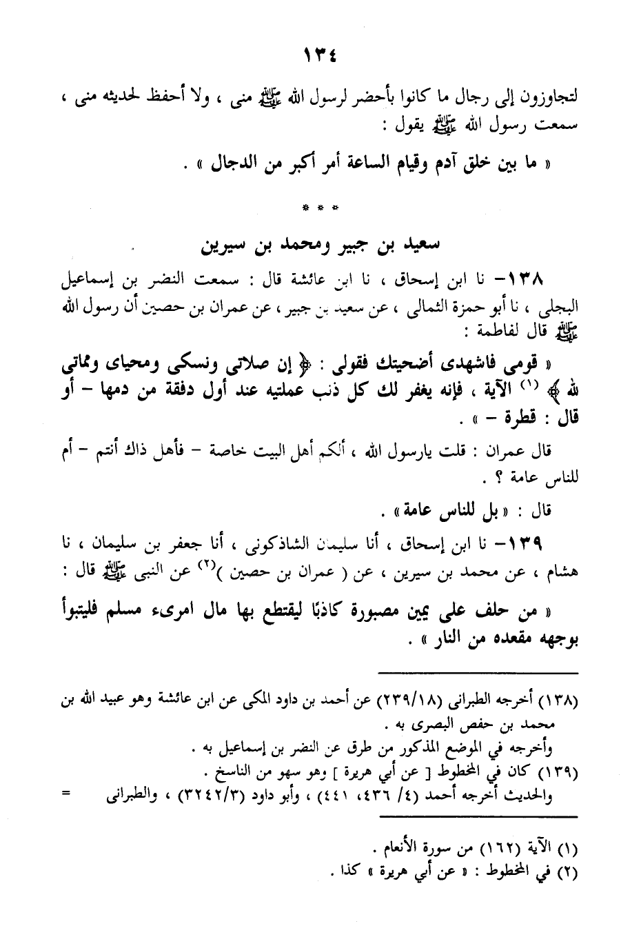 138 - نا ابْنُ إِسْحَاقَ، نا ابْنُ عَائِشَةَ قَالَ: سَمِعْتُ النَّضْرَ بْنَ إِسْمَاعِيلَ الْبَجَلِيَّ، نا أَبُو حَمْزَةَ الثُّمَالِيُّ، عَنْ سَعِيدِ بْنِ جُبَيْرٍ، عَنْ عِمْرَانَ بْنِ حُصَيْنٍ: أَنَّ رَسُولَ اللَّهِ صَلَّى اللهُ عَلَيْهِ وَسَلَّمَ قَالَ لِفَاطِمَةَ: " §قَوْمِي فاشْهَدِي أُضْحِيَتَكِ، فَقُولِي: {إنَّ صَلَاتِي وَنُسُكِي وَمَحْيَايَ وَمَمَاتِي لِلَّهِ} [الأنعام: 162] الْآيَةُ، فَإِنَّهُ يُغْفَرُ لَكِ كُلُّ ذَنْبٍ عَمِلْتِيهِ عِنْدَ أَوَّلِ دَفْقَةٍ مِنْ دَمِهَا - أَوْ قَالَ: قَطْرَةٍ " قَالَ عِمْرَانُ: قُلْتُ: يَا رَسُولَ اللَّهِ، أَلَكُمْ أَهْلَ الْبَيْتِ خَاصَّةً، فَأَهْلُ ذَاكَ أَنْتُمْ؟، أَمْ لِلنَّاسِ عَامَّةً؟ قَالَ: «بَلْ لِلنَّاسِ عَامَّةً»