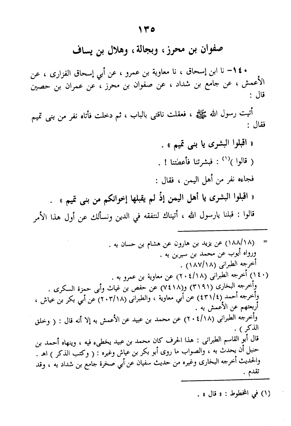 140 - نا ابْنُ إِسْحَاقَ، نا مُعَاوِيَةُ بْنُ عَمْرٍو، عَنْ أَبِي إِسْحَاقَ الْفَزَارِيِّ، عَنِ الْأَعْمَشِ، عَنْ جَامِعِ بْنِ شَدَّادٍ، عَنْ صَفْوَانَ بْنِ مُحْرِزٍ، عَنْ عِمْرَانَ بْنِ حُصَيْنٍ قَالَ: أَتَيْتُ رَسُولَ اللَّهِ صَلَّى اللهُ عَلَيْهِ وَسَلَّمَ فَعَقَلْتُ نَاقَتِي بِالْبَابِ ثُمَّ دَخَلْتُ، فَأَتَاهُ نَفَرٌ مِنْ بَنِي تَمِيمٍ، فَقَالَ: «اقْبَلُوا الْبُشْرَى يَا بَنِي تَمِيمٍ» قَالُوا: فَبَشَّرْتَنَا فَأَعْطِنَا، فَجَاءَهُ نَفَرٌ مِنْ أَهْلِ الْيَمَنِ فَقَالَ: «§اقْبَلُوا الْبُشْرَى أَهْلَ الْيَمَنِ إِذْ لَمْ يَقْبَلْهَا إِخْوَانُكُمْ مِنْ بَنِي تَمِيمٍ» قَالُوا: قَبْلِنَا يَا رَسُولَ اللَّهِ، أَتَيْنَاكَ لِنَتَفَقَّهَ فِي الدِّينِ وَنَسْأَلَكَ عَنْ أَوَّلِ هَذَا الْأَمْرِ -[136]-، كَيْفَ كَانَ؟ قَالَ: «كَانَ اللَّهُ وَلَمْ يَكُ شَيْءٌ غَيْرُهُ، وَكَانَ عَرْشُهُ عَلَى الْمَاءِ، ثُمَّ كَتَبَ فِي الذِّكْرِ كُلَّ شَيْءٍ، ثُمَّ خَلَقَ السَّمَاوَاتِ وَالْأرْضِ» ثُمَّ قَالَ: أَتَانِي رَجُلٌ فَقَالَ: أَدْرِكْ نَاقَتَكَ قَدْ ذَهَبَتْ، فَخَرَجْتُ فَوَجَدْتُهَا يَنْقَطِعُ دُونَهَا السَّرَابُ، وَايْمُ اللَّهِ لَوَدِدْتُ أَنِّي كُنْتُ تَرَكْتُهَا "