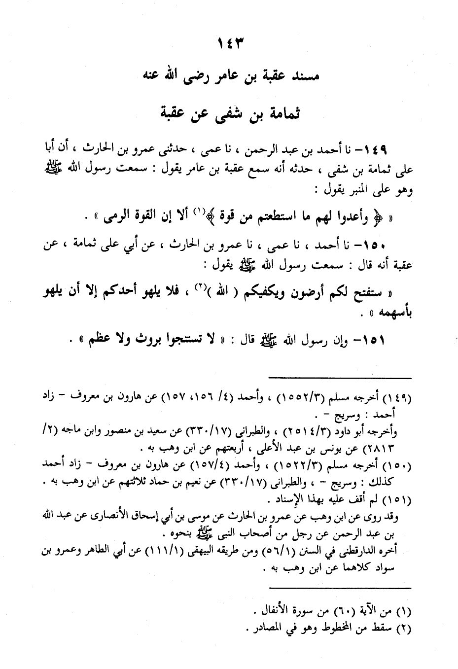 150 - نا أَحْمَدُ، نا عَمِّي، نا عَمْرُو بْنُ الْحَارِثِ، عَنْ أَبِي عَلِيٍّ ثُمَامَةَ، عَنْ عُقْبَةَ أَنَّهُ قَالَ: سَمِعْتُ رَسُولَ اللَّهِ صَلَّى اللهُ عَلَيْهِ وَسَلَّمَ يَقُولُ: «§سَتُفْتَحُ لَكُمْ أَرَضُونَ وَيَكْفِيكُمُ اللَّهُ فَلَا يَلْهُ أَحَدُكُمْ إِلَّا أَنْ يَلْهُوَ بِأَسْهُمِهِ»