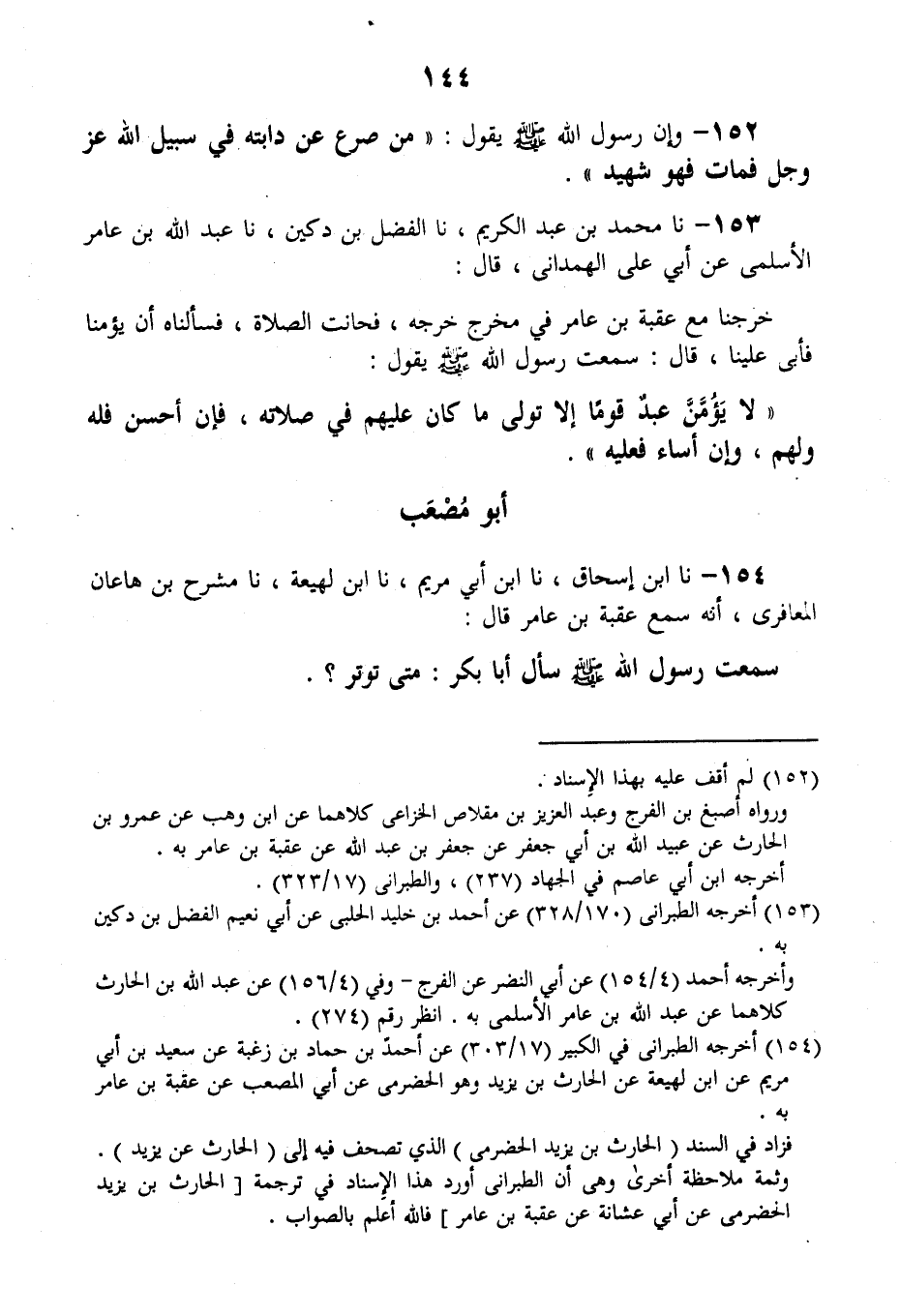 154 - نا ابْنُ إِسْحَاقَ، نا ابْنُ أَبِي مَرْيَمَ، نا ابْنُ لَهِيعَةَ، نا مِشْرَحُ بْنُ هَاعَانَ الْمَعَافِرِيُّ أَنَّهُ سَمِعَ عُقْبَةَ بْنَ عَامِرٍ قَالَ: سَمِعْتُ رَسُولَ اللَّهِ صَلَّى اللهُ عَلَيْهِ وَسَلَّمَ سَأَلَ أَبَا بَكْرٍ: مَتَى تُوتِرُ؟ -[145]- قَالَ: أُصَلِّي مَثْنَى مَثْنَى ثُمَّ أَوْتِرُ قَبْلَ أَنْ أَنَامَ، فَقَالَ لَهُ رَسُولُ اللَّهِ صَلَّى اللهُ عَلَيْهِ وَسَلَّمَ: «§مُؤْمِنٌ حَازِمٌ» وَقَالَ لِعُمَرَ بْنِ الْخَطَّابِ: " كَيْفَ تُوتِرُ؟ قَالَ: أُصَلِّي مَثْنَى مَثْنَى ثُمَّ أَنَامُ حَتَّى أَوْتِرَ مِنْ آخِرِ اللَّيْلِ، قَالَ رَسُولُ اللَّهِ صَلَّى اللهُ عَلَيْهِ وَسَلَّمَ: «هَذَا مُؤْمِنٌ قَوِيٌّ»