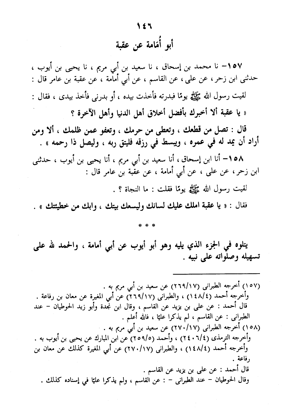 157 - نا مُحَمَّدُ بْنُ إِسْحَاقَ نا سَعِيدُ بْنُ أَبِي مَرْيَمَ، نا يَحْيَى بْنُ أَيُّوبَ، حَدَّثَنِي ابْنُ زَحْرٍ، عنْ عَلِيٍّ، عنِ الْقَاسِمِ، عَنْ أَبِي أُمَامَةَ، عَنْ عُقْبَةَ بْنِ عَامِرٍ قَالَ: لَقِيتُ رَسُولَ اللَّهِ صَلَّى اللهُ عَلَيْهِ وَسَلَّمَ يَوْمًا فَبَدَرْتُهُ فَأَخَذْتُ بِيَدِهِ، أَوْ بَدَرَنِي فَأَخَذَ بِيَدِي، فَقَالَ: " يَا عُقْبَةُ أَلَا أُخْبِرُكَ بِأَفْضَلِ أَخْلَاقِ أَهْلِ الدُّنْيَا وَأَهْلِ الْآخِرَةِ؟ قَالَ: «§تَصِلُ مَنْ قَطَعَكَ، وَتُعْطِي مَنْ حَرَمَكَ، وَتَعْفُو عَمَّنْ ظَلَمَكَ، أَلَا وَمَنْ أَرَادَ أَنْ يُمَدَّ لَهُ فِي عُمْرِهِ وَيُبْسَطَ فِي رِزْقِهِ فَلْيَتَّقِ رَبَّهُ، وَلْيَصِلْ ذَا رَحِمِهِ»