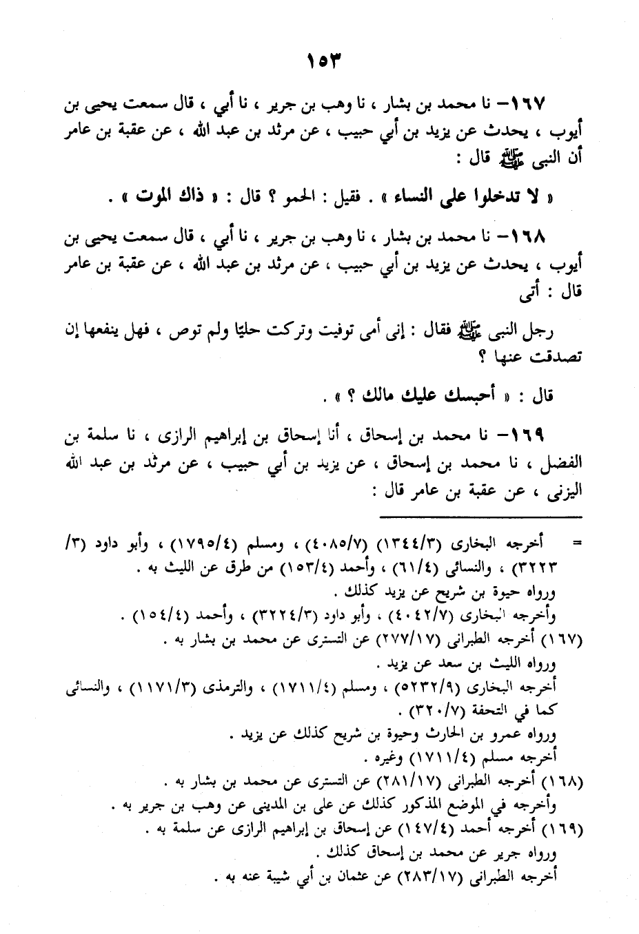 167 - نا مُحَمَّدُ بْنُ بَشَّارٍ، نا وَهْبُ بْنُ جَرِيرٍ، نا أَبِي قَالَ: سَمِعْتُ يَحْيَى بْنَ أَيُّوبَ يُحَدِّثُ عَنْ يَزِيدَ بْنِ أَبِي حَبِيبٍ، عَنْ مَرْثَدِ بْنِ عَبْدِ اللَّهِ، عَنْ عُقْبَةَ بْنِ عَامِرٍ: أَنَّ النَّبِيَّ صَلَّى اللهُ عَلَيْهِ وَسَلَّمَ قَالَ: «§لَا تَدْخُلُوا عَلَى النِّسَاءِ» فَقِيلَ: الْحَمْوُ قَالَ: «ذَاكَ الْمَوْتُ»