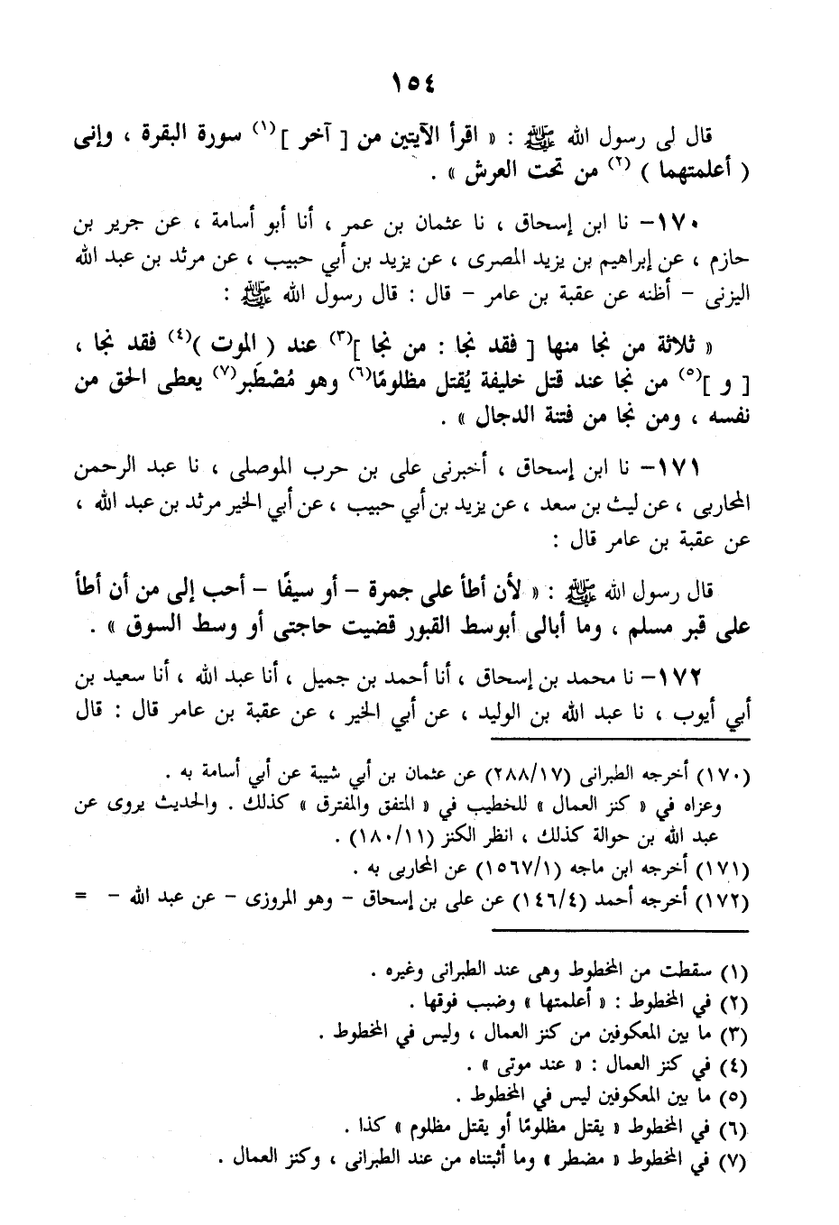 171 - نا ابْنُ إِسْحَاقَ، أَخْبَرَنِي عَلِيُّ بْنُ حَرْبٍ الْمَوْصِلِيُّ، نا عَبْدُ الرَّحْمِنِ الْمُحَارِبِيُّ، عَنْ لَيْثِ بْنِ سَعْدٍ، عَنْ يَزِيدَ بْنِ أَبِي حَبِيبٍ، عَنْ أَبِي الْخَيْرِ مَرْثَدِ بْنِ عَبْدِ اللَّهِ، عَنْ عُقْبَةَ بْنِ عَامِرٍ قَالَ: قَالَ رَسُولُ اللَّهِ صَلَّى اللهُ عَلَيْهِ وَسَلَّمَ: «§لَأنْ أَطَأَ عَلَى جَمْرَةٍ - أَوْ سَيْفًا - أَحَبُّ إِلَيَّ مِنْ أَنْ أَطَأَ عَلَى قَبْرِ مُسْلِمٍ، وَمَا أُبَالِي أَبِوَسَطِ الْقُبُورِ قَضَيْتُ حَاجَتِي، أَوْ وَسَطِ السُّوقِ»