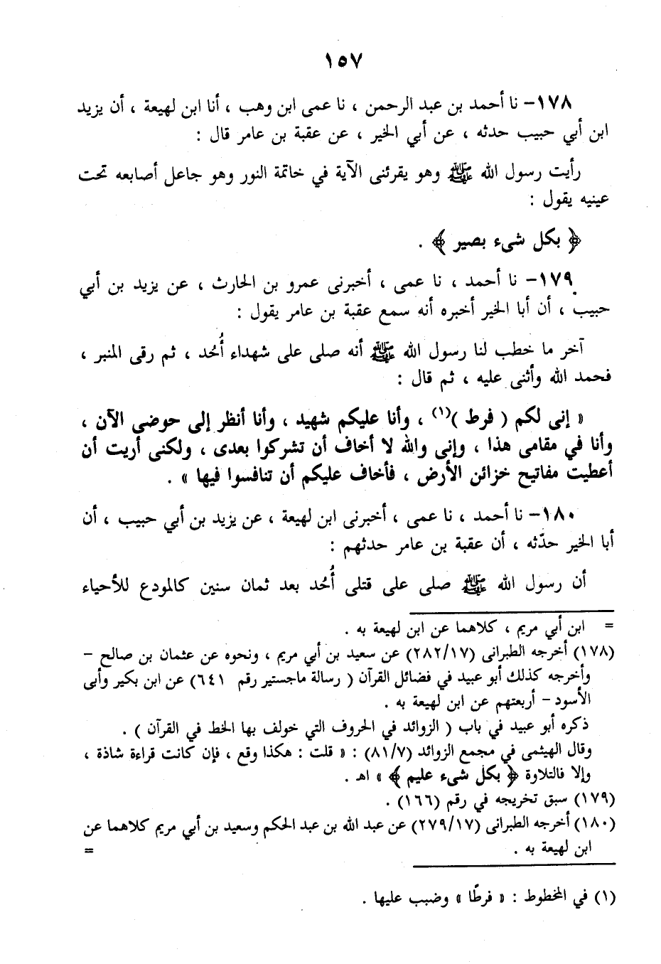 180 - نا أَحْمَدُ، نا عَمِّي، أَخْبَرَنِي ابْنُ لَهِيعَةَ، عَنْ يَزِيدَ بْنِ أَبِي حَبِيبٍ، أَنَّ أَبَا الْخَيْرِ حَدَّثَهُ، أَنَّ عُقْبَةَ بْنَ عَامِرٍ حَدَّثَهُمْ، أَنَّ رَسُولَ اللَّهِ صَلَّى اللهُ عَلَيْهِ وَسَلَّمَ صَلَّى عَلَى قَتْلَى أُحُدٍ بَعْدَ ثَمَانِ سِنِينَ كَالْمُوَدِّعِ لِلَأَحْيَاءِ -[158]- وَالْأَمْوَاتِ، ثُمَّ طَلَعَ الْمِنْبَرَ فَقَالَ: «§إِنِّي بَيْنَ أَيْدِيكُمْ فَرَطٌ، وَأَنَا عَلَيْكُمْ شَهِيدٌ، وَإِنَّ مَوْعِدَكُمُ الْحَوْضُ، وَإِنِّي لَأَنْظُرُ إِلَيْهِ الْآنَ وَأَنَا فِي مَقَامِي هَذَا، وَإِنِّي لَسْتُ أَخْشَى أَنْ تُشْرِكُوا، وَلَكِنْ أَخْشَى عَلَيْكُمْ أَنْ تَنَافَسُوهَا» قَالَ عُقْبَةُ: وَكَانَتْ آخِرَ نَظْرَةٍ نَظَرْتُهَا إِلَى رَسُولِ اللَّهِ صَلَّى اللهُ عَلَيْهِ وَسَلَّمَ