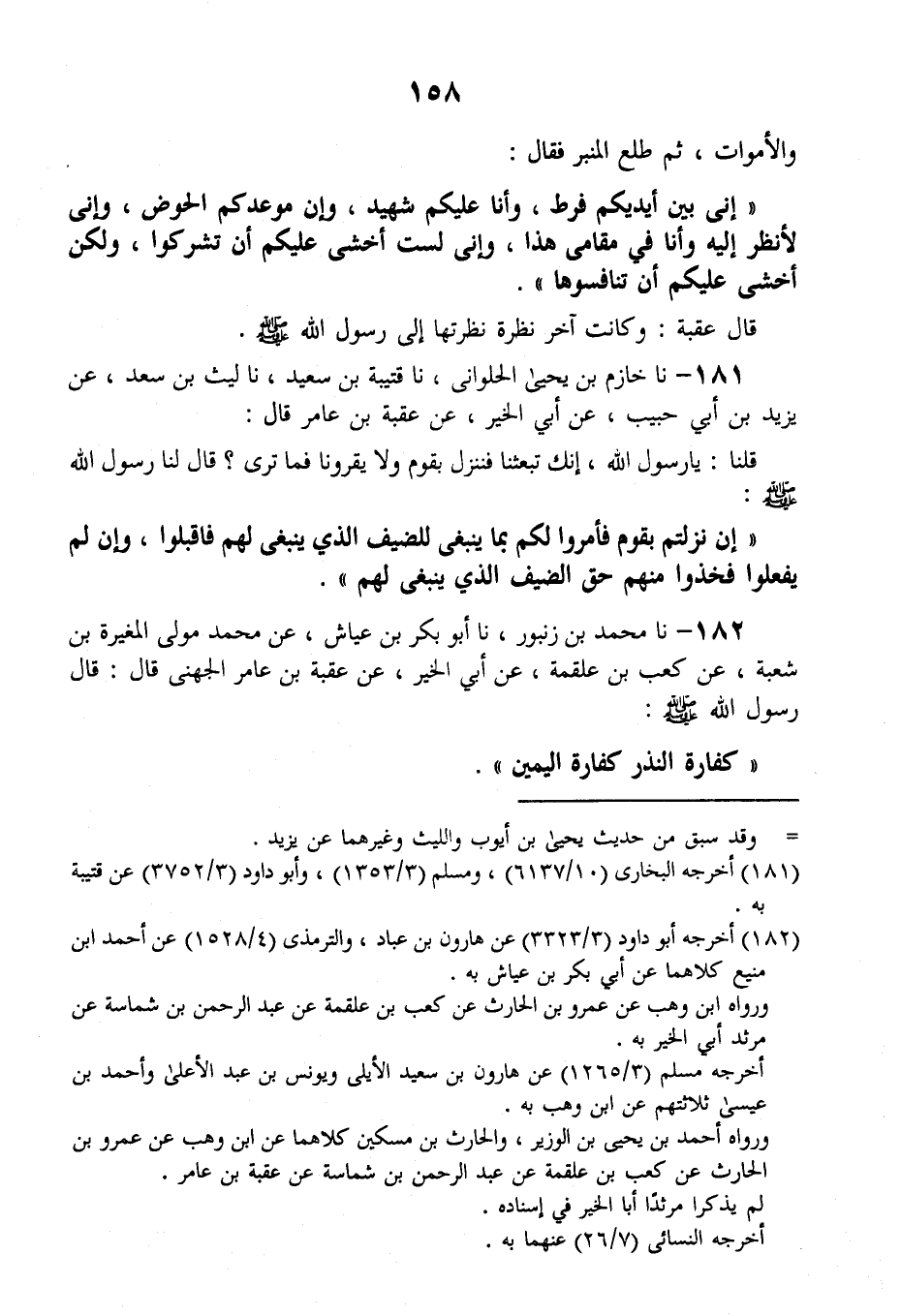 181 - نا خَازِمُ بْنُ يَحْيَى الْحُلْوَانِيُّ، نا قُتَيْبَةُ بْنُ سَعِيدٍ، نا لَيْثُ بْنُ سَعْدٍ، عَنْ يَزِيدَ بْنِ أَبِي حَبِيبٍ، عَنْ أَبِي الْخَيْرِ، عَنْ عُقْبَةَ بْنِ عَامِرٍ قَالَ: قُلْنَا: يَا رَسُولَ اللَّهِ، إِنَّكَ تَبْعَثُنَا فَنَنْزِلُ بِقَوْمٍ وَلَا يَقْرُونَا، فَمَا تَرَى؟ قَالَ لَنَا رَسُولُ اللَّهِ صَلَّى اللهُ عَلَيْهِ وَسَلَّمَ: «§إِنْ نَزَلْتُمْ بِقَوْمٍ فَأَمَرُوا لَكُمْ بِمَا يَنْبَغِي لِلضَّيْفِ الَّذِي يَنْبَغِي لَهُمْ فَاقْبَلُوا، وَإِنْ لَمْ يَفْعَلُوا فَخُذُوا مِنْهُمْ حَقَّ الضَّيْفِ الَّذِي يَنْبَغِي لَهُمْ»