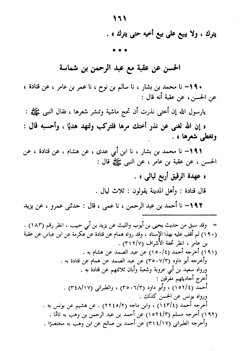 191 - نا مُحَمَّدُ بْنُ بَشَّارٍ، نا ابْنُ أَبِي عَدِيٍّ، عَنْ هِشَامٍ، عَنْ قَتَادَةَ، عَنِ الْحَسَنِ، عَنْ عُقْبَةَ بْنِ عَامِرٍ، عَنِ النَّبِيِّ صَلَّى اللهُ عَلَيْهِ وَسَلَّمَ قَالَ: «§عُهْدَةُ الرَّقِيقِ أَرْبَعُ لَيَالٍ» قَالَ قَتَادَةُ: وَأَهْلُ الْمَدِينَةِ يَقُولُونَ: ثَلَاثُ لَيَالٍ