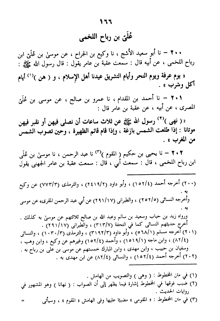 200 - نا أَبُو سَعِيدٍ الْأَشَجُّ، نا، وَكِيعُ بْنُ الْجَرَّاحِ، عَنْ مُوسَى بْنِ عُلَيِّ بْنِ رَبَاحٍ اللَّخْمِيِّ، عَنْ أَبِيهِ قَالَ: سَمِعْتُ عُقْبَةَ بْنَ عَامِرٍ يَقُولُ: قَالَ رَسُولُ اللَّهِ صَلَّى اللهُ عَلَيْهِ وَسَلَّمَ: «§يَوْمُ عَرَفَةَ وَيَوْمُ النَّحْرِ وأيَامُ التَّشْرِيقِ عِيدُنَا أَهْلَ الِإِسْلَامِ، وَهُنَّ أَيَّامُ أَكْلٍ وَشُرْبٍ»