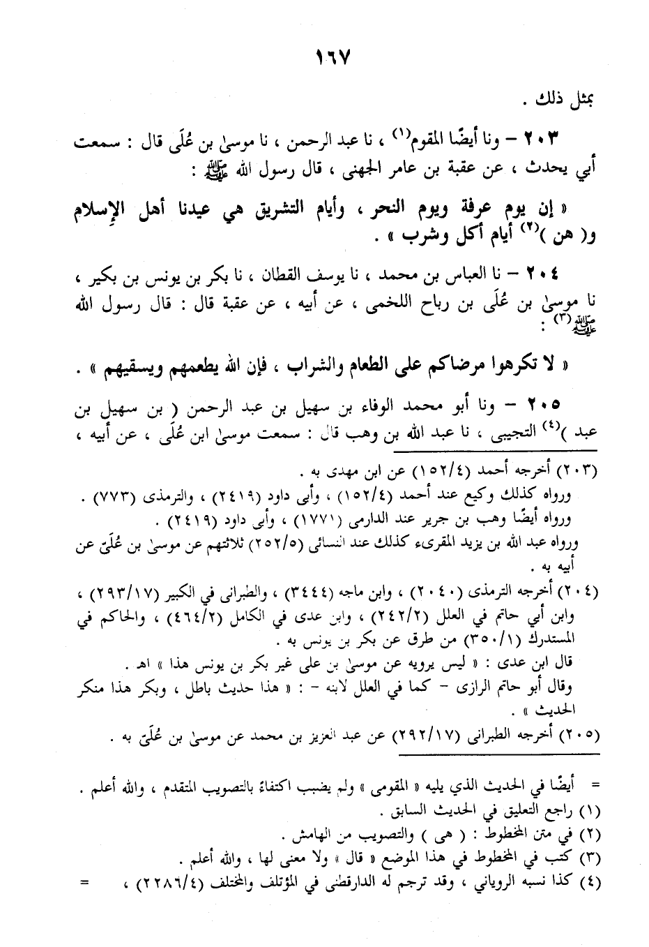 203 - ونا أَيْضًا الْمُقَوِّمُ، نا عَبْدُ الرَّحْمَنِ، نا مُوسَى بْنُ عُلَيٍّ قَالَ: سَمِعْتُ أَبِي، يُحَدِّثُ، عَنْ عُقْبَةَ بْنِ عَامِرٍ الْجُهَنِيِّ: قَالَ رَسُولُ اللَّهِ صَلَّى اللهُ عَلَيْهِ وَسَلَّمَ: «§إنَّ يَوْمَ عَرَفَةَ وَيَوْمَ النَّحْرِ وأيَامَ التَّشْرِيقِ هِيَ عِيدُنَا أَهْلَ الِإِسْلَامِ، وَهُنَّ أَيَّامُ أَكْلٍ وَشُرْبٍ»