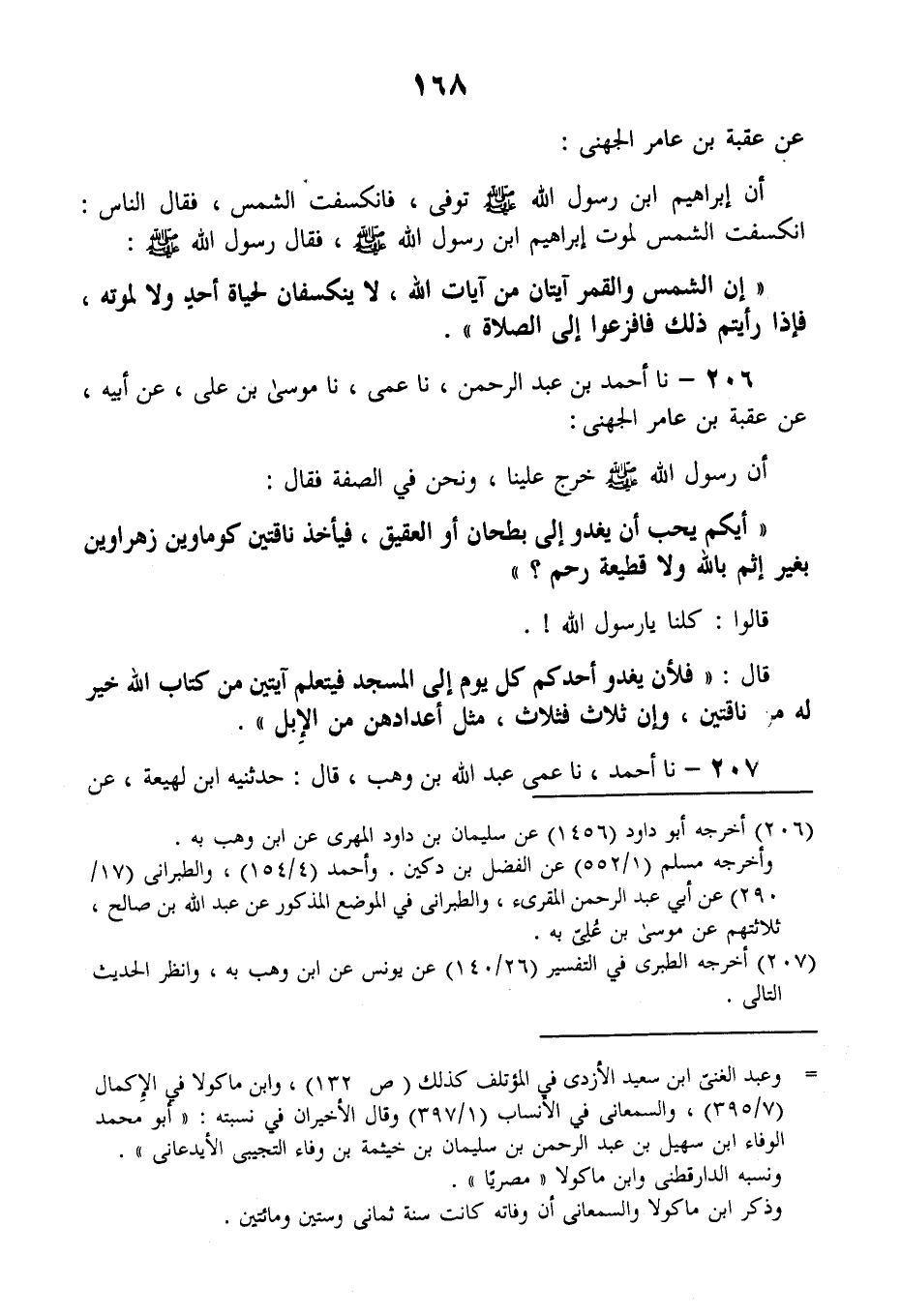 206 - نا أَحْمَدُ بْنُ عَبْدِ الرَّحْمَنِ، نا عَمِّي، نا مُوسَى بْنُ عُلَيٍّ، عَنْ أَبِيهِ، عَنْ عُقْبَةَ بْنِ عَامِرٍ الْجُهَنِيِّ: أَنَّ رَسُولَ اللَّهِ صَلَّى اللهُ عَلَيْهِ وَسَلَّمَ خَرَجَ عَلَيْنَا وَنَحْنُ فِي الصُّفَّةِ فَقَالَ: «§أَيُّكُمْ يُحِبُّ أَنْ يَغْدُوَ إِلَى بَطْحَانَ أَوِ الْعَقِيقِ فَيَأْخُذَ نَاقَتَيْنِ كَوْمَاوَيْنِ زَهْرَاوَيْنِ بِغَيْرِ إثْمٍ بِاللَّهِ وَلَا قَطِيعَةِ رَحِمٍ» قَالُوا: كُلُّنَا يَا رَسُولَ اللَّهِ، قَالَ: «فَلَأَنْ يَغْدُوَ أَحَدُكُمْ كُلَّ يَوْمٍ إِلَى الْمَسْجِدِ فَيَتَعَلَّمَ آيَتَيْنِ مِنْ كِتَابِ اللَّهِ خَيْرٌ لَهُ مِنْ نَاقَتَيْنِ، وَإِنْ ثَلَاثٌ فَثَلَاثٌ مِثْلُ أَعْدَادِهِنَّ مِنَ الْإِبِلِ»