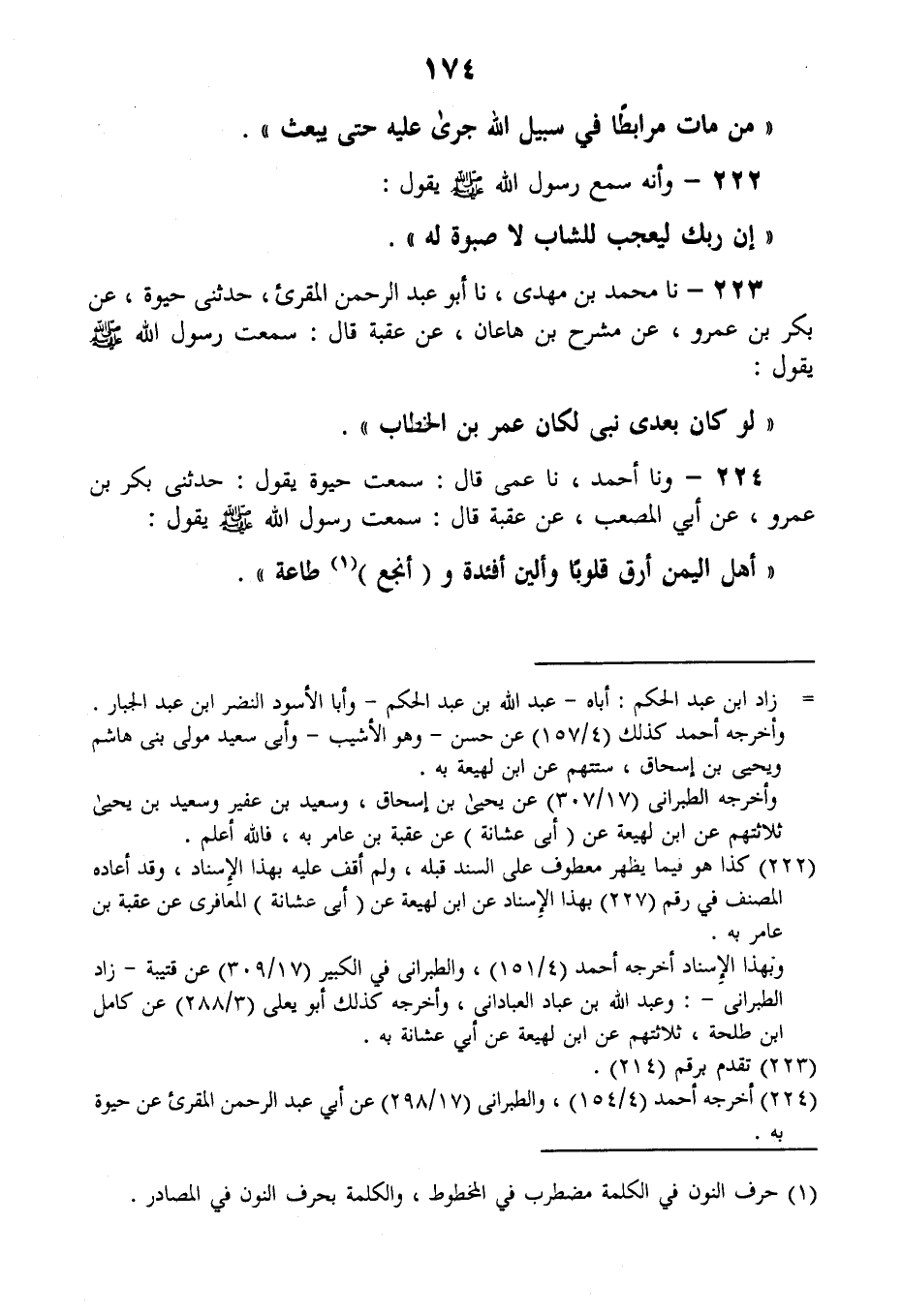 223 - نا مُحَمَّدُ بْنُ مَهْدِيٍّ، نا أَبُو عَبْدِ الرَّحْمَنِ الْمُقْرِئُ، حَدَّثَنِي حَيْوَةُ، عَنْ بَكْرِ بْنِ عَمْرٍو، عَنْ مِشْرَحِ بْنِ هَاعَانَ، عَنْ عُقْبَةَ قَالَ: سَمِعْتُ رَسُولَ اللَّهِ صَلَّى اللهُ عَلَيْهِ وَسَلَّمَ يَقُولُ: «§لَوْ كَانَ بَعْدِي نَبِيٌّ لَكَانَ عُمَرَ بْنَ الْخَطَّابِ»