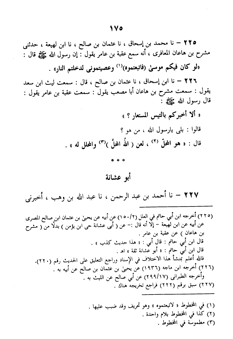 226 - نا ابْنُ إِسْحَاقَ، نا عُثْمَانُ بْنُ صَالِحٍ قَالَ: سَمِعْتُ لَيْثَ بْنَ سَعْدٍ يَقُولُ: سَمِعْتُ مِشْرَحَ بْنَ هَاعَانَ أَبَا مُصْعَبٍ يَقُولُ: سَمِعْتُ عُقْبَةَ بْنَ عَامِرٍ يَقُولُ: قَالَ رَسُولُ اللَّهِ صَلَّى اللهُ عَلَيْهِ وَسَلَّمَ: «§أَلَا أُخْبِرُكُمْ بِالتَّيْسِ الْمُسْتَعَارِ؟» قَالُوا: بَلَى يَا رَسُولَ اللَّهِ، مَنْ هُوَ؟ قَالَ: «هُوَ الْمُحِلُّ، لَعَنَ اللَّهُ الْمُحِلَّ وَالْمُحَلَّلَ لَهُ»