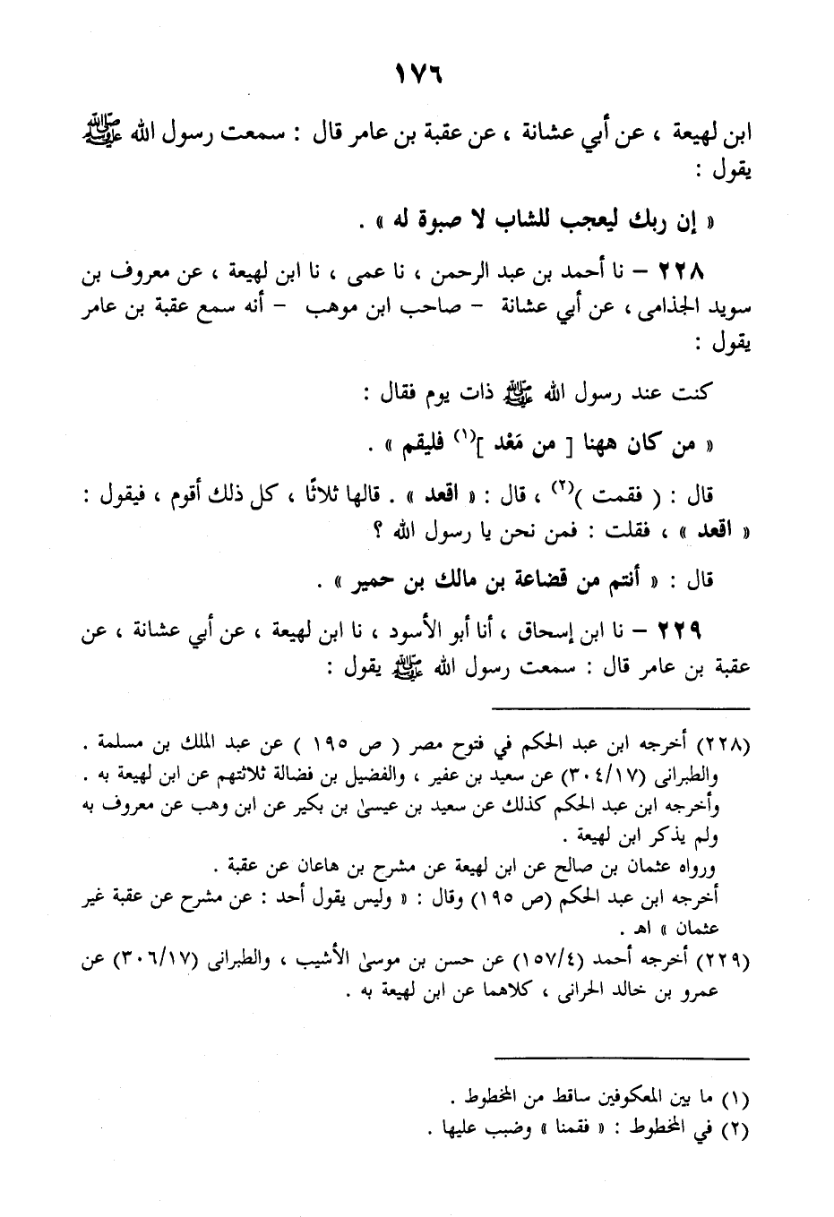 228 - نا أَحْمَدُ بْنُ عَبْدِ الرَّحْمَنِ، نا عَمِّي، نا ابْنُ لَهِيعَةَ، عَنْ مَعْرُوفِ بْنِ سُوَيْدٍ الْجُذَامِيِّ، عَنْ أَبِي عُشَّانَةَ، صَاحِبِ ابْنِ مَوْهَبٍ، أَنَّهُ سَمِعَ عُقْبَةَ بْنَ عَامِرٍ يَقُولُ: كُنْتُ عِنْدَ رَسُولِ اللَّهِ صَلَّى اللهُ عَلَيْهِ وَسَلَّمَ ذَاتَ يَوْمٍ فَقَالَ: «§مَنْ كَانَ هَا هُنَا مِنْ مَعَدٍّ فَلْيَقُمْ» قَالَ: فَقُمْتُ، قَالَ: «اقْعُدْ» قَالَهَا ثَلَاثًا، كُلُّ ذَلِكَ أَقُومُ فَيَقُولُ: «اقْعُدْ» فَقُلْتُ: فَمَنْ نَحْنُ يَا رَسُولَ اللَّهِ؟ قَالَ: «أَنْتُمْ مِنْ قُضَاعَةَ بْنِ مَالِكِ بْنِ حِمْيَرَ»