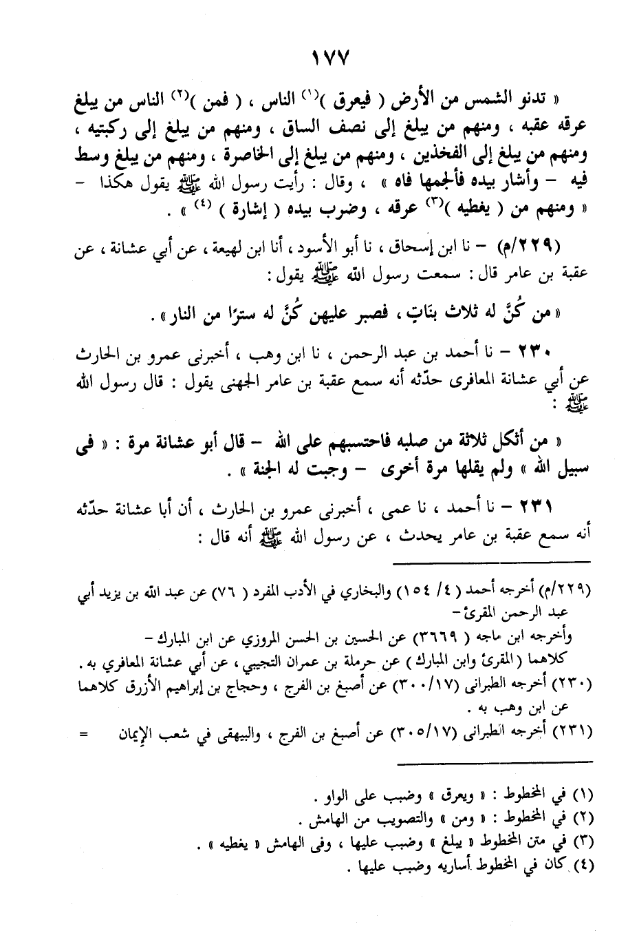 230 - نا أَحْمَدُ بْنُ عَبْدِ الرَّحْمَنِ، نا ابْنُ وَهْبٍ، أَخْبَرَنِي عَمْرُو بْنُ الْحَارِثِ، عَنْ أَبِي عُشَّانَةَ الْمَعَافِرِيِّ، حَدَّثَهُ أَنَّهُ سَمِعَ عُقْبَةَ بْنَ عَامِرٍ الْجُهَنِيَّ يَقُولُ: قَالَ رَسُولُ اللَّهِ صَلَّى اللهُ عَلَيْهِ وَسَلَّمَ: " §مَنْ أَثْكَلَ ثَلَاثَةً مِنْ صُلْبِهِ فَاحْتَسَبَهُمْ عَلَى اللَّهِ - قَالَ أَبُو عُشَّانَةَ مَرَّةً: فِي سَبِيلِ اللَّهِ، وَلَمْ يَقُلْهَا مَرَّةً أُخْرَى - وَجَبَتْ لَهُ الْجَنَّةُ "