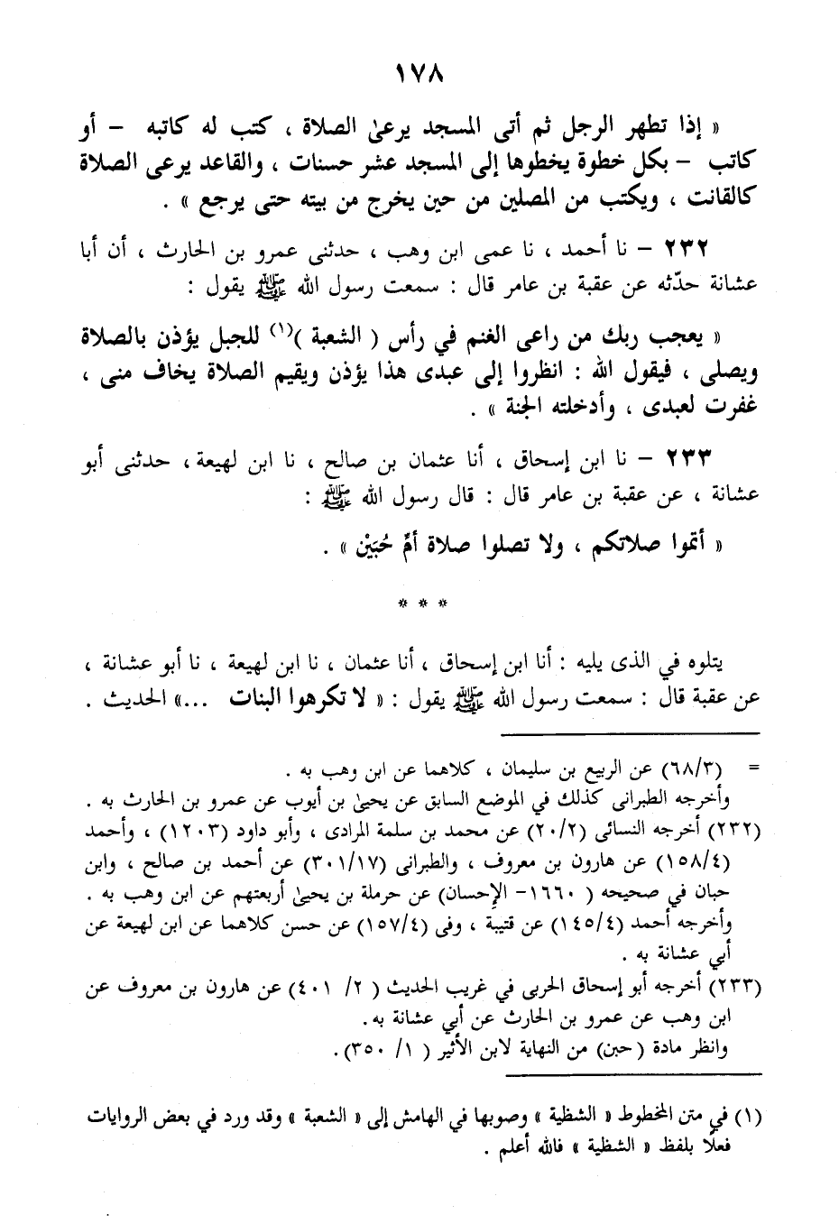 232 - نا أَحْمَدُ، نا عَمِّي ابْنُ وَهْبٍ، حَدَّثَنِي عَمْرُو بْنُ الْحَارِثِ، أَنَّ أَبَا عُشَّانَةَ، حَدَّثَهُ، عَنْ عُقْبَةَ بْنِ عَامِرٍ قَالَ: سَمِعْتُ رَسُولَ اللَّهِ صَلَّى اللهُ عَلَيْهِ وَسَلَّمَ يَقُولُ: " §يَعْجَبُ رَبُّكَ مِنْ رَاعِي الْغَنَمِ فِي رَأْسِ الشُّعْبَةِ لِلْجَبَلِ يُؤَذِّنُ بِالصَّلَاةِ وَيُصَلِّي، فَيَقُولُ اللَّهُ: انْظُرُوا إِلَى عَبْدِي هَذَا يُؤَذِّنُ وَيُقِيمُ الصَّلَاةَ يَخَافُ مِنِّي، غَفَرْتُ لِعَبْدِي وَأَدْخَلْتُهُ الْجَنَّةَ "