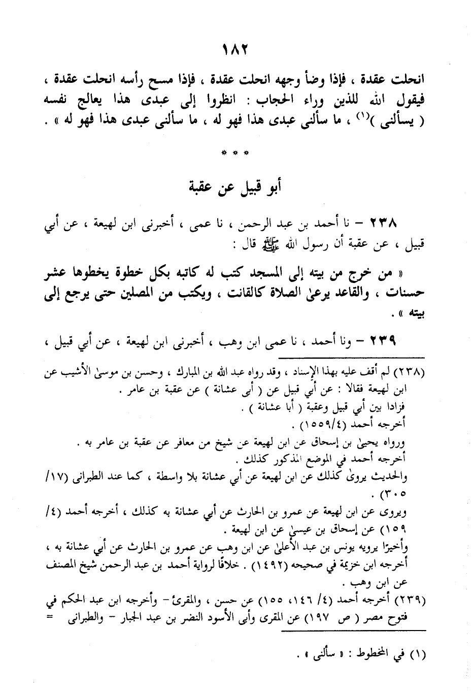 238 - نا أَحْمَدُ بْنُ عَبْدِ الرَّحْمَنِ، نا عَمِّي، أَخْبَرَنِي ابْنُ لَهِيعَةَ، عَنْ أَبِي قَبِيلٍ، عَنْ عُقْبَةَ: أَنَّ رَسُولَ اللَّهِ صَلَّى اللهُ عَلَيْهِ وَسَلَّمَ قَالَ: «§مَنْ خَرَجَ مِنْ بَيْتِهِ إِلَى الْمَسْجِدِ كَتَبَ لَهُ كَاتِبُهُ بِكُلِّ خُطْوَةٍ يَخْطُوهَا عَشْرَ حَسَنَاتٍ، وَالْقَاعِدُ يَرْعَى الصَّلَاةَ كَالْقَانِتِ، وَيُكْتَبُ مِنَ الْمُصَلِّينَ حَتَّى يَرْجِعَ إِلَى بَيْتِهِ»
