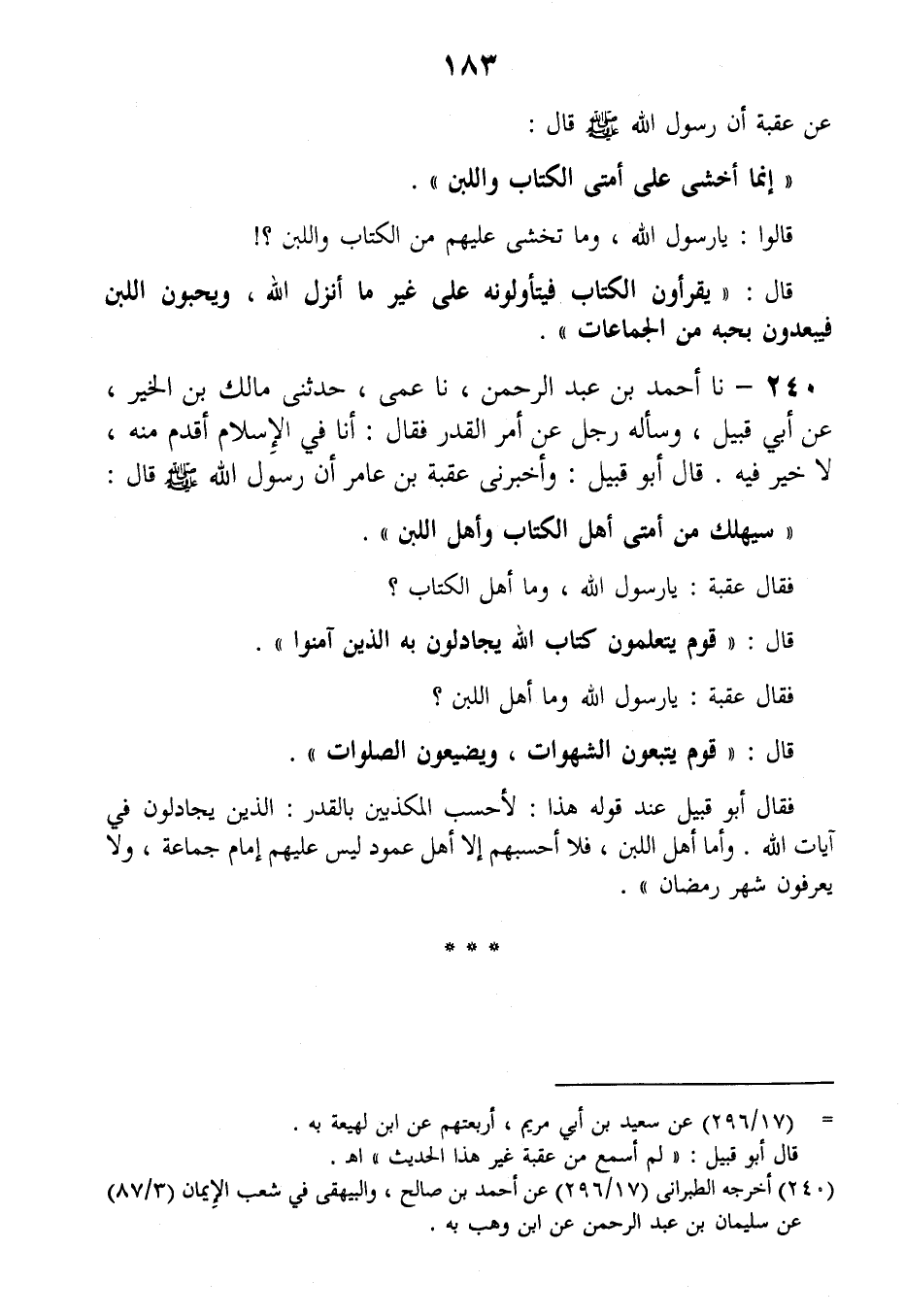 240 - نا أَحْمَدُ بْنُ عَبْدِ الرَّحْمَنِ، نا عَمِّي، حَدَّثَنِي مَالِكُ بْنُ الْخَيْرِ، عَنْ أَبِي قَبِيلٍ وَسَأَلَهُ رَجُلٌ عَنْ أَمْرِ الْقَدَرِ، فَقَالَ: أَنَا فِي الِإِسْلَامِ أقْدَمُ مِنْهُ، لَا خَيْرَ فِيهِ، قَالَ أَبُو قَبِيلٍ: وأخْبَرَنِي عُقْبَةُ بْنُ عَامِرٍ: أَنَّ رَسُولَ اللَّهِ صَلَّى اللهُ عَلَيْهِ وَسَلَّمَ قَالَ: «§سَيَهْلِكُ مِنْ أُمَّتِي أَهْلُ الْكِتَابِ وأهْلُ اللَّبَنِ» فَقَالَ عُقْبَةُ: يَا رَسُولَ اللَّهِ، وَمَا أَهْلُ الْكِتَابِ؟ قَالَ: «قَوْمٌ يَتَعَلَّمُونَ كِتَابَ اللَّهِ يُجَادِلُونَ بِهِ الَّذِينَ آمَنُوا» فَقَالَ عُقْبَةُ: يَا رَسُولَ اللَّهِ، وَمَا أَهْلُ اللَّبَنِ؟ قَالَ: «قَوْمٌ يَتَّبِعُونَ الشَّهَوَاتِ، ويُضَيِّعُونَ الصَّلَوَاتِ» فَقَالَ أَبُو قَبِيلٍ عِنْدَ قَوْلِهِ هَذَا: لَأَحْسَبُ الْمُكَذِّبِينَ بِالْقَدَرِ: الَّذِينَ يُجَادِلُونَ فِي آيَاتِ اللَّهِ، وَأَمَّا أَهْلُ اللَّبَنِ، فَلَا أَحْسَبُهُمْ إِلَّا أَهْلَ عَمُودٍ لَيْسَ عَلَيْهِمْ إِمَامُ جَمَاعَةٍ، وَلَا يَعْرِفُونَ شَهْرَ رَمَضَانَ "