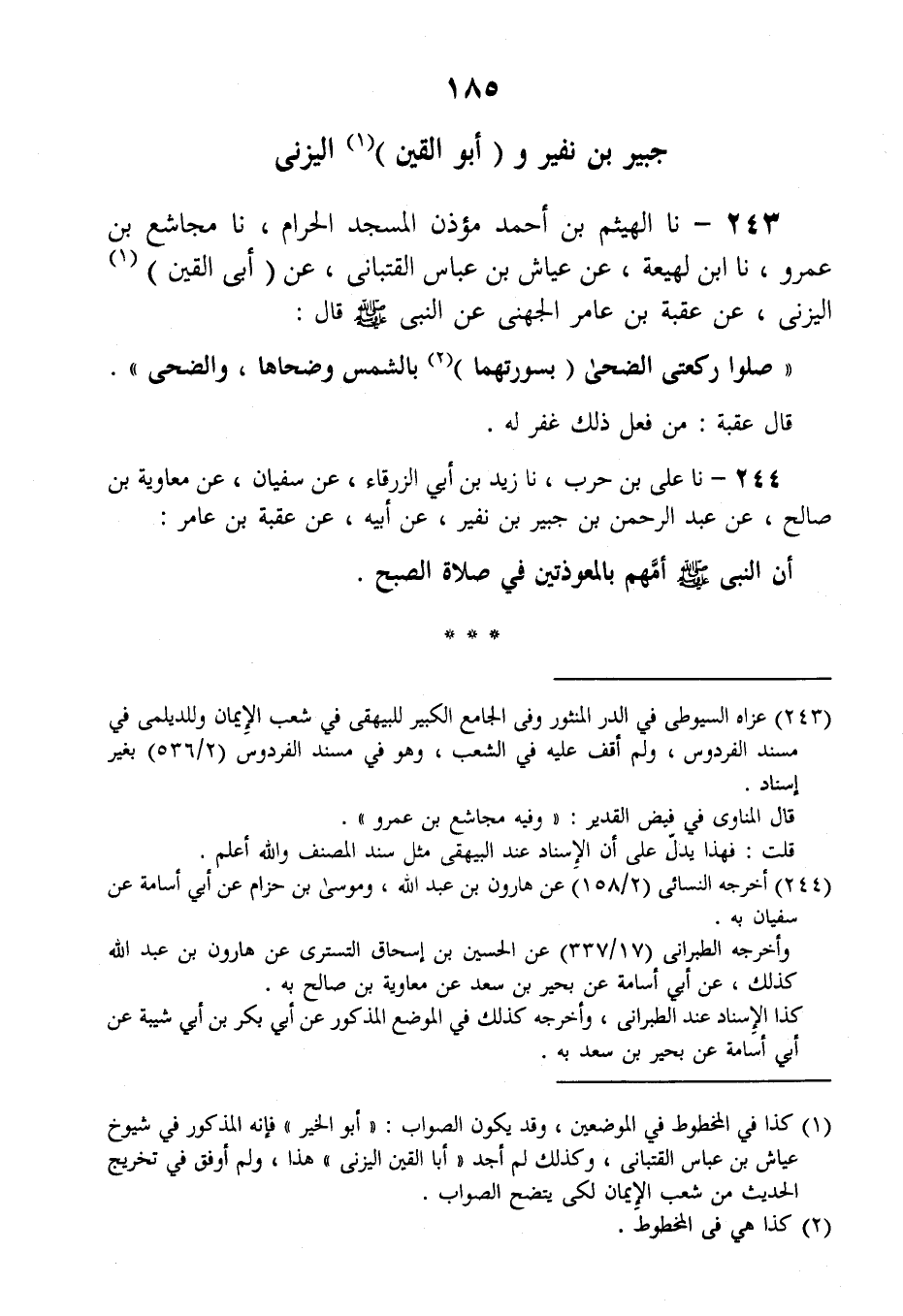 244 - نا عَلِيُّ بْنُ حَرْبٍ، نا زَيْدُ بْنُ أَبِي الزَّرْقَاءِ، عَنْ سُفْيَانَ، عَنْ مُعَاوِيَةَ بْنِ صَالِحٍ، عَنْ عَبْدِ الرَّحْمَنِ بْنِ جُبَيْرِ بْنِ نُفَيْرٍ، عَنْ أَبِيهِ، عَنْ عُقْبَةَ بْنِ عَامِرٍ، أَنَّ النَّبِيَّ صَلَّى اللهُ عَلَيْهِ وَسَلَّمَ §أَمَّهُمْ بِالْمُعَوِّذَتَيْنِ فِي صَلَاةِ الصُّبْحِ "