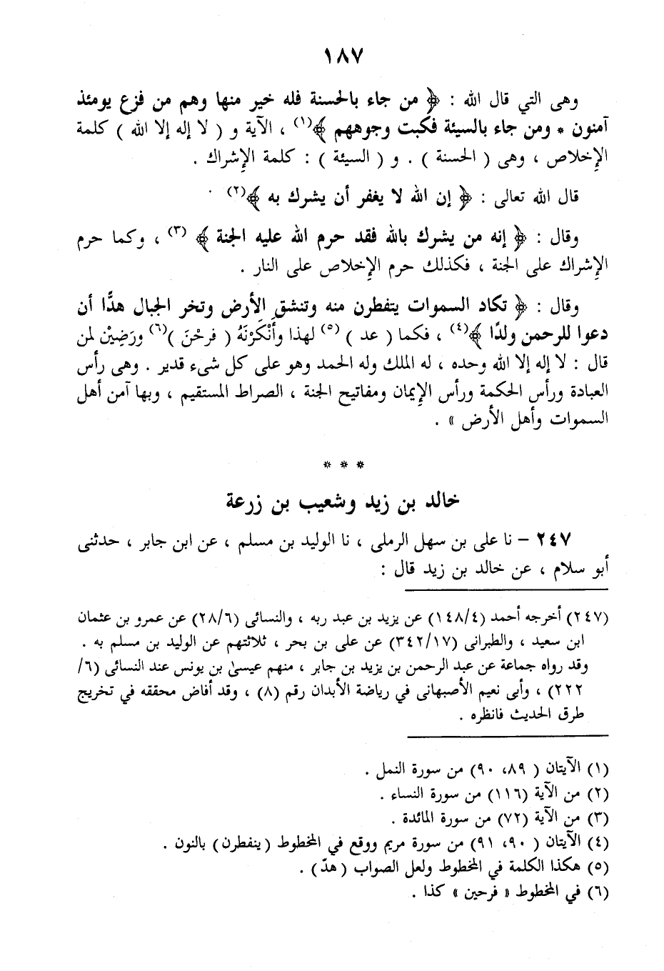 247 - نا عَلِيُّ بْنُ سَهْلٍ الرَّمْلِيُّ، نا الْوَلِيدُ بْنُ مُسْلِمٍ، عَنِ ابْنِ جَابِرٍ، حَدَّثَنِي أَبُو سَلَّامٍ، عَنْ خَالِدِ بْنِ زَيْدٍ قَالَ -[188]-: كُنْتُ رَامِيًا أُرَامِي عُقْبَةَ بْنَ عَامِرٍ، فَمَرَّ بِي ذَاتَ يَوْمٍ فَقَالَ لِي: يَا خَالِدُ، اخْرُجْ بِنَا نَرْمِي، فَأَبْطَأْتُ عَلَيْهِ فَقَالَ: تَعَالَ أُحَدِّثْكَ مَا حَدَّثَنِي رَسُولُ اللَّهِ صَلَّى اللهُ عَلَيْهِ وَسَلَّمَ، قَالَ رَسُولُ اللَّهِ صَلَّى اللهُ عَلَيْهِ وَسَلَّمَ: " §إنَّ اللَّهَ يُدْخِلُ بِالسَّهْمِ الْوَاحِدِ ثَلَاثَةً الْجَنَّةَ: صَانِعَهُ الَّذِي يَحْتَسِبُ فِي صَنْعَتِهِ الْخَيْرَ، وَمُنْبِلَهُ، وَالرَّامِيَ بِهِ، ارْمُوا وَارْكَبُوا، وَأَنْ تَرَامَوْا أَحَبُّ إِلَىَّ مِنْ أَنْ تَرْكَبُوا، وَلَيْسَ مِنَ اللَّهْوِ إِلَّا ثَلَاثٌ: تَأْدِيبُ الرَّجُلِ فَرَسَهُ، وَمُلَاعَبَتُهُ امْرَأَتَهُ، وَرَمْيُهُ بِقَوْسِهِ وَنَبْلِهِ، وَمَنْ عَلِمَ الرَّمْيَ ثُمَّ تَرَكَهَا فَهِيَ نِعْمَةٌ كَفَرَهَا "