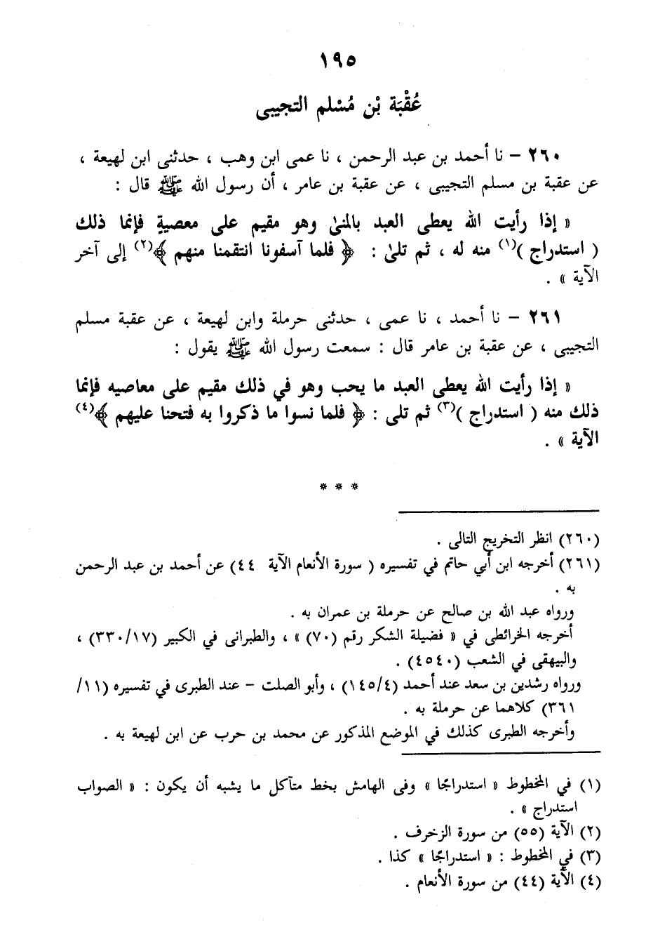 261 - نا أَحْمَدُ، نا عَمِّي، حَدَّثَنِي حَرْمَلَةُ وَابْنُ لَهِيعَةَ، عَنْ عُقْبَةَ بْنِ مُسْلِمٍ التُّجِيبِيِّ، عَنْ عُقْبَةَ بْنِ عَامِرٍ قَالَ: سَمِعْتُ رَسُولَ اللَّهِ صَلَّى اللهُ عَلَيْهِ وَسَلَّمَ يَقُولُ: «§إِذَا رَأَيْتَ اللَّهَ يُعْطِي الْعَبْدَ مَا يُحِبُّ وَهُوَ فِي ذَلِكَ مُقِيمٌ عَلَى مَعَاصِيهِ، فَإِنَّمَا ذَلِكَ مِنْهُ اسْتِدْرَاجٌ» ثُمَّ تَلَا {فَلَمَّا نَسُوا مَا ذُكِّرُوا بِهِ فَتَحْنَا عَلَيْهِمْ} [الأنعام: 44] الْآيَةَ