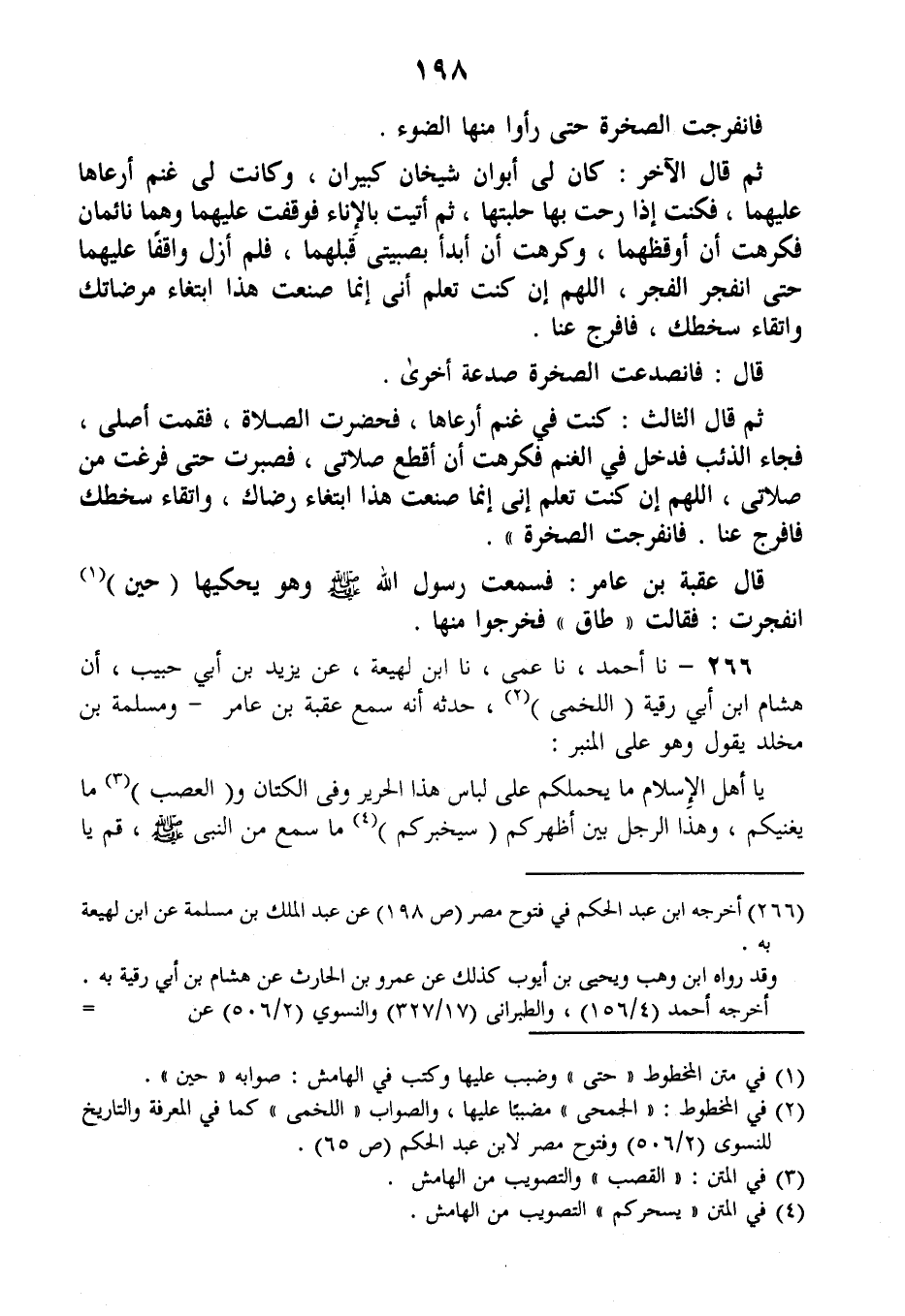266 - نا أَحْمَدُ، نا عَمِّي، نا ابْنُ لَهِيعَةَ، عَنْ يَزِيدَ بْنِ أَبِي حَبِيبٍ، أَنَّ هِشَامَ بْنَ أَبِي رُقَيَّةَ اللَّخْمِيَّ حَدَّثَهُ أَنَّهُ سَمِعَ عُقْبَةَ بْنَ عَامِرٍ - وَمَسْلَمَةَ بْنَ مَخْلَدٍ يَقُولُ وَهُوَ عَلَى الْمِنْبَرِ: يَا أَهْلَ الِإِسْلَامِ، مَا يَحْمِلُكُمْ عَلَى لِبَاسِ هَذَا الْحَرِيرِ، وَفِي الْكَتَّانِ وَالْعَصْبِ مَا يُغْنِيكُمْ، وَهَذَا الرَّجُلُ بَيْنَ أَظْهُرِكُمْ سَيُخْبِرُكُمْ مَا سَمِعَ مِنَ النَّبِيِّ صَلَّى اللهُ عَلَيْهِ وَسَلَّمَ، قُمْ يَا -[199]- عُقْبَةُ، فَقَامَ عُقْبَةُ فَقَالَ: سَمِعْتُ رَسُولَ اللَّهِ صَلَّى اللهُ عَلَيْهِ وَسَلَّمَ يَقُولُ: «§مَنْ لَبِسَ الْحَرِيرَ فِي الدُّنْيَا حَرَّمَهُ اللَّهُ أَنْ يَلْبَسَهُ فِي الْآخِرَةِ»