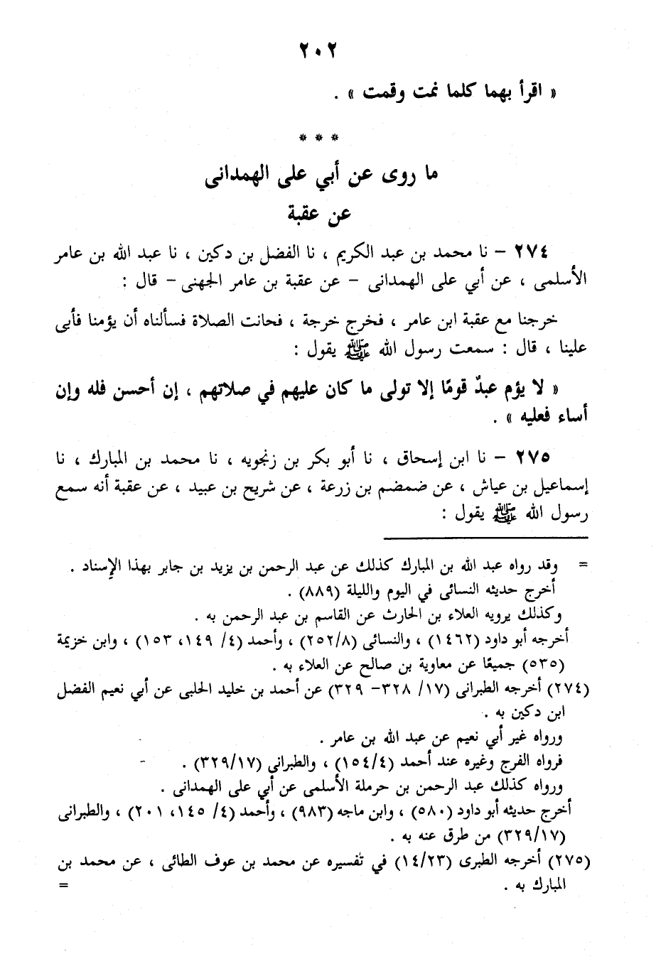 274 - نا مُحَمَّدُ بْنُ عَبْدِ الْكَرِيمِ، نا الْفَضْلُ بْنُ دُكَيْنٍ، نا عَبْدُ اللَّهِ بْنُ عَامِرٍ الْأَسْلَمِيُّ، عَنْ أَبِي عَلِيٍّ الْهَمْدَانِيِّ، عَنْ عُقْبَةَ بْنِ عَامِرٍ الْجُهَنِيِّ قَالَ: خَرَجْنَا مَعَ عُقْبَةَ بْنِ عَامِرٍ، فَخَرَجَ خَرْجَةً فَحَانَتِ الصَّلَاةُ، فَسَأَلْنَاهُ أَنْ يَؤُمَّنَا فَأَبَى عَلَيْنَا، قَالَ: سَمِعْتُ رَسُولَ اللَّهِ صَلَّى اللهُ عَلَيْهِ وَسَلَّمَ يَقُولُ: «§لَا يَؤُمُّ عَبْدٌ قَوْمًا إِلَّا تَوَلَّى مَا كَانَ عَلَيْهِمْ فِي صَلَاتِهِمْ، إنْ أَحْسَنَ فَلَهُ، وَإِنْ أَسَاءَ فَعَلَيْهِ»