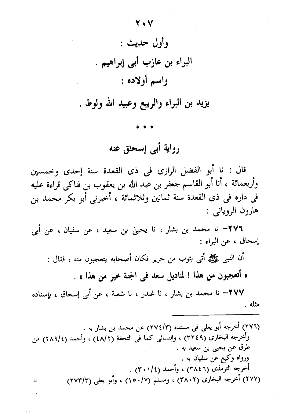 276 - نا مُحَمَّدُ بْنُ بَشَّارٍ، نا يَحْيَى بْنُ سَعِيدٍ، عَنْ سُفْيَانَ، عَنْ أَبِي إِسْحَاقَ، عَنِ الْبَرَاءِ أَنَّ النَّبِيَّ صَلَّى اللهُ عَلَيْهِ وَسَلَّمَ أَتَى بِثَوْبٍ مِنْ حَرِيرٍ، فَكَانَ أَصْحَابُهُ يَتَعَجَّبُونَ مِنْهُ، فَقَالَ: «§أَتَعْجَبُونَ مِنْ هَذَا؟ لَمَنَادِيلُ سَعْدٍ فِي الْجَنَّةِ خَيْرٌ مِنْ هَذَا»