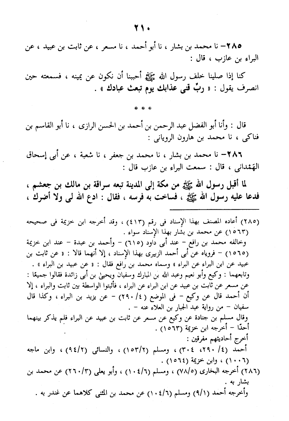 286 - نَا مُحَمَّدُ بْنُ بَشَّارٍ، نا مُحَمَّدُ بْنُ جَعْفَرٍ، نا شُعْبَةُ، عَنْ أَبِي إِسْحَاقَ الْهَمْدَانِيِّ قَالَ: سَمِعْتُ الْبَرَاءَ بْنَ عَازِبٍ قَالَ: لَمَّا أَقْبَلَ رَسُولُ اللَّهِ صَلَّى اللهُ عَلَيْهِ وَسَلَّمَ مِنْ مَكَّةَ إِلَى الْمَدِينَةِ تَبِعَهُ سُرَاقَةُ بْنُ مَالِكِ بْنِ جُعْشُمٍ، §فَدَعَا عَلَيْهِ رَسُولُ اللَّهِ صَلَّى اللهُ عَلَيْهِ وَسَلَّمَ، فَسَاخَتْ بِهِ فَرَسُهُ، فَقَالَ: ادْعُ اللَّهَ لِي وَلَا أَضُرُّكَ -[211]-، قَالَ: فَدَعَا، فَعَطِشَ رَسُولُ اللَّهِ صَلَّى اللهُ عَلَيْهِ وَسَلَّمَ فَمَرَّ بِرَاعٍ، فَقَالَ أَبُو بَكْرٍ الصِّدِّيقُ: فَأَخَذْتُ قَدْحًا فَحَلَبْتُ فِيهِ كُثْبَةً مِنْ لَبَنٍ، فَأَتَيْتُهُ بِهِ فَشَرِبَ، ثُمَّ شَرِبْتُ حَتَّى رَضِيتُ "