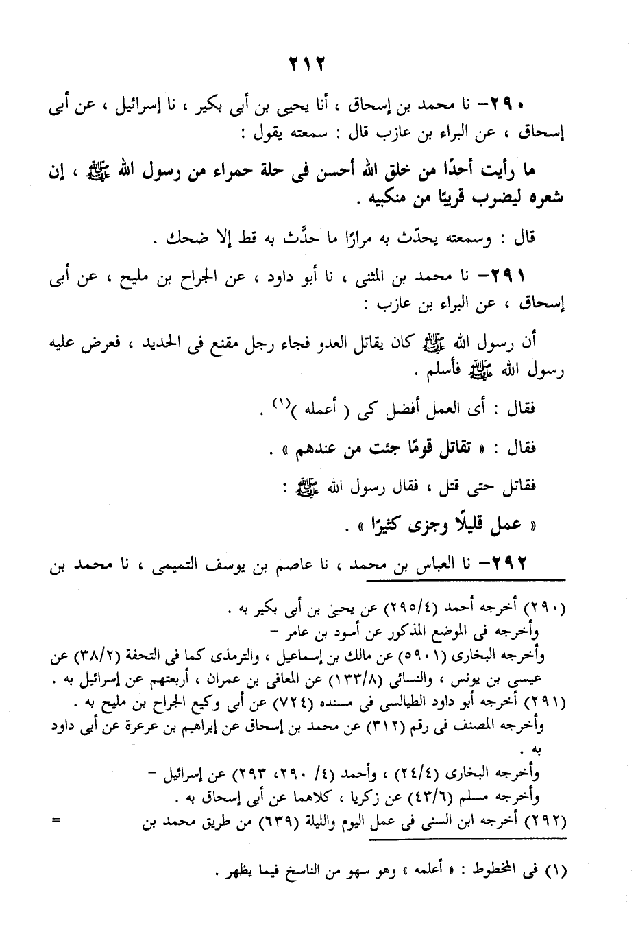 291 - نا مُحَمَّدُ بْنُ الْمُثَنَّى، نا أَبُو دَاوُدَ، عَنِ الْجَرَّاحِ بْنِ مَلِيحٍ، عَنْ أَبِي إِسْحَاقَ، عَنِ الْبَرَاءِ بْنِ عَازِبٍ أَنَّ رَسُولَ اللَّهِ صَلَّى اللهُ عَلَيْهِ وَسَلَّمَ كَانَ يُقَاتِلُ الْعَدُوَّ، فَجَاءَ رَجُلٌ مُقَنَّعٌ فِي الْحَدِيدِ، فَعَرَضَ عَلَيْهِ رَسُولُ اللَّهِ صَلَّى اللهُ عَلَيْهِ وَسَلَّمَ فَأَسْلَمَ، فَقَالَ: §أَيُّ الْعَمَلِ أَفْضَلُ كَيْ أَعْمَلَهُ؟ فَقَالَ: «تُقَاتِلُ قَوْمًا جِئْتَ مِنْ عِنْدَهُمْ» فَقَاتَلَ حَتَّى قُتِلَ، فَقَالَ رَسُولُ اللَّهِ صَلَّى اللهُ عَلَيْهِ وَسَلَّمَ: «عَمِلَ قَلِيلًا وَجُزِيَ كَثِيرًا»
