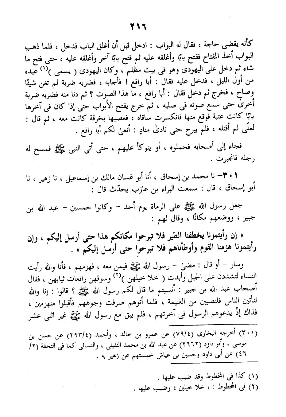 301 - نا مُحَمَّدُ بْنُ إِسْحَاقَ، أنا أَبُو غَسَّانَ مَالِكُ بْنُ إِسْمَاعِيلَ، نا زُهَيْرٌ، نا أَبُو إِسْحَاقَ قَالَ: سَمِعْتُ الْبَرَاءَ بْنَ عَازِبٍ، يُحَدِّثُ قَالَ: جَعَلَ رَسُولُ اللَّهِ صَلَّى اللهُ عَلَيْهِ وَسَلَّمَ عَلَى الرُّمَاةِ يَوْمَ أُحُدٍ، وَكَانُوا خَمْسِينَ، عَبْدَ اللَّهِ بْنَ جُبَيْرٍ، وَوَضَعَهُمْ مَكَانًا وَقَالَ لَهُمْ: «§إنْ رَأَيْتُمُونَا يَخْطَفُنَا الطَّيْرُ فَلَا تَبْرَحُوا مَكَانَكُمْ هَذَا حَتَّى أُرْسِلَ إِلَيْكُمْ، وَإِنْ رَأَيْتُمُونَا هَزَمْنَا الْقَوْمَ وَأَوْطَأْنَاهُمْ فَلَا تَبْرَحُوا حَتَّى أُرْسِلَ إِلَيْكُمْ» وَسَارَ - أَوْ قَالَ مَضَى - رَسُولُ اللَّهِ صَلَّى اللهُ عَلَيْهِ وَسَلَّمَ فِيمَنْ مَعَهُ فَهَزَمَهُمْ، فَأَنَا وَاللَّهِ رَأَيْتُ النِّسَاءَ لَتَشْدُدْنَ عَلَى الْجَبَلِ، وَأَبْدَتْ خَلَاخِيلَهُنَّ وَسُوقَهُنَّ رَافِعَاتٍ ثِيَابَهُنَّ، فَقَالَ أَصْحَابُ عَبْدِ اللَّهِ بْنِ جُبَيْرٍ: أَنَسِيتُمْ مَا قَالَ لَكُمْ رَسُولُ اللَّهِ صَلَّى اللهُ عَلَيْهِ وَسَلَّمَ؟ قَالُوا: إِنَّا وَاللَّهِ لَنَأْتِيَنَّ النَّاسَ فَلَنُصِيبَنَّ مِنَ الَغَنِيمَةِ، فَلَمَّا أَتَوْهُمْ صُرِفَتْ وُجُوهُهُمْ، فَأَقْبَلُوا مُنْهَزِمِينَ فَذَاكَ إِذْ يَدْعُوهُمُ الرَّسُولُ فِي آخِرَتِهِمْ، فَلَمْ يَبْقَ مَعَ رَسُولِ اللَّهِ صَلَّى اللهُ عَلَيْهِ وَسَلَّمَ غَيْرُ اثْنَيْ عَشْرَ -[217]- رَجُلًا، فَأَصَابُوا مِنَّا سَبْعِينَ، وَكَانَ رَسُولُ اللَّهِ صَلَّى اللهُ عَلَيْهِ وَسَلَّمَ وَأَصْحَابُهُ أَصَابُوا مِنَ الْمُشْرِكِينَ يَوْمَ بَدْرٍ أَرْبَعِينَ وَمِائَةً، سَبْعِينَ أَسِيرًا وَسَبْعِينَ قَتِيلًا، فَجَاءَ أَبُو سُفْيَانَ فَقَالَ: أَفِي الْقَوْمِ مُحَمَّدٌ؟ فَنَهَاهُمْ رَسُولُ اللَّهِ أَنْ يُجِيبُوهُ، فَقَالَ: أَفِي الْقَوْمِ ابْنُ أَبِي قُحَافَةَ؟ ثَلَاثَ مَرَّاتٍ، أَفِي الْقَوْمِ ابْنُ الْخَطَّابِ؟ ثَلَاثَ مَرَّاتٍ، ثُمَّ رَجَعَ إِلَى أَصْحَابِهِ فَقَالَ: أَمَّا هَؤُلَاءِ فَقَدْ قُتِلُوا، فَمَا مَلَكَ عُمَرُ نَفْسَهُ فَقَالَ: كَذَبْتَ يَا عَدُوَّ اللَّهِ، إِنَّ الَّذِينَ أَعْدَدْتَ لَأَحْيَاءٌ كُلُّهُمْ، وَقَدْ بَقِيَ لَكَ مَا يَسُوؤُكَ، فَقَالَ: يَوْمٌ بِيَوْمٍ، وَالْحَرْبُ سِجَالٌ، إِنَّكُمْ سَتَجِدُونَ فِي الْقَوْمِ مُثْلَةً لَمْ آمُرْ بِهَا وَلَمْ تَسُؤْنِي، وَجَعَلَ يَرْتَجِزُ: اعْلُ هُبَلُ، اعْلُ هُبَلُ، فَقَالَ رَسُولُ اللَّهِ صَلَّى اللهُ عَلَيْهِ وَسَلَّمَ: «أَلَا تُجِيبُوهُ» فَقَالُوا: يَا رَسُولَ اللَّهِ، مَا نَقُولُ؟ قَالَ: " قُولُوا: اللَّهُ أَعْلَى وَأَجَلُّ " قَالَ: إِنَّ لَنَا الْعُزَّى، وَلَا عُزَّى لَكُمْ، فَقَالَ رَسُولُ اللَّهِ صَلَّى اللهُ عَلَيْهِ وَسَلَّمَ: «أَلَا تُجِيبُوهُ» قَالُوا: يَا رَسُولَ اللَّهِ، مَا نَقُولُ؟ قَالَ: " قُولُوا: اللَّهُ مَوْلَانَا وَلَا مَوْلَى لَكُمْ "