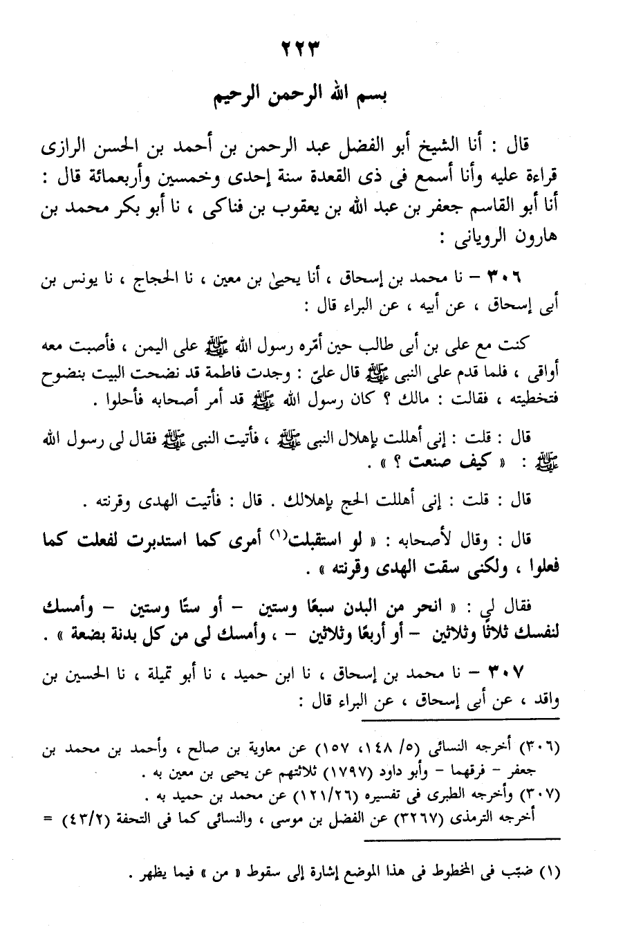306 - نا مُحَمَّدُ بْنُ إِسْحَاقَ، نا يَحْيَى بْنُ مَعَينٍ، نا الْحَجَّاجُ، حَدَّثَنَا يُونُسُ بْنُ أَبِي إِسْحَاقَ، عَنْ أَبِيهِ، عَنِ الْبَرَاءِ قَالَ: كُنْتُ مَعَ عَلِيِّ بْنِ أَبِي طَالِبٍ حِينَ أَمَّرَهُ رَسُولُ اللَّهِ صلىاللَّهُ عَلَيْهِ وَسَلَّمَ عَلَى الْيَمَنِ، فَأَصَبْتُ مَعَهُ أَوَاقِيَّ، فَلَمَّا قَدِمَ عَلَى النَّبِيِّ صَلَّى اللهُ عَلَيْهِ وَسَلَّمَ قَالَ عَلِيٌّ: وَجَدْتُ فَاطِمَةَ قَدْ نَضَحَتِ الْبَيْتَ بِنَضُوحٍ فَتَخَطَّيْتُهُ فَقَالَتْ: مَا لَكَ؟ كَانَ رَسُولُ اللَّهِ صَلَّى اللهُ عَلَيْهِ وَسَلَّمَ قَدْ أَمَرَ أَصْحَابَهُ فَأَحَلُّوا، قَالَ: قُلْتُ: إِنِّي أَهْلَلْتُ بِإِهْلَالِ النَّبِيِّ صَلَّى اللهُ عَلَيْهِ وَسَلَّمَ، فَأَتَيْتُ النَّبِيَّ صَلَّى اللهُ عَلَيْهِ وَسَلَّمَ فَقَالَ لِي رَسُولُ اللَّهِ صَلَّى اللهُ عَلَيْهِ وَسَلَّمَ: «كَيْفَ صَنَعْتَ؟» قَالَ: قُلْتُ: إِنِّي أَهْلَلْتُ الْحَجَّ بِإِهْلَالِكَ، قَالَ: فَأَتَيْتُ الْهَدْيَ وَقَرَنْتُهُ، قَالَ: وَقَالَ لِأَصْحَابِهِ: «لَوِ اسْتَقْبَلْتُ أَمْرِي، كَمَا اسْتَدْبَرْتُ لَفَعَلْتُ كَمَا فَعَلُوا، وَلَكِنِّي سُقْتُ الْهَدْىَ وَقَرَنْتُهُ» فَقَالَ لِي: «§انْحَرْ مِنَ الْبُدْنِ سَبْعًا وَسِتِّينَ - أَوْ سِتًّا وَسِتِّينَ - وَأَمْسِكْ لِنَفْسِكَ ثَلَاثًا وَثَلَاثِينَ - أَوْ أَرْبَعًا وَثَلَاثِينَ - وَأَمْسِكْ لِي مِنْ كُلِّ بَدَنَةٍ بَضْعَةً»