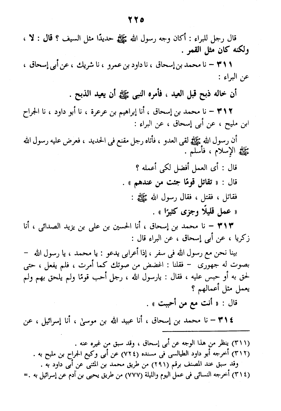 312 - نا مُحَمَّدُ بْنُ إِسْحَاقَ، أنا إِبْرَاهِيمُ بْنُ عَرْعَرَةَ، نا أَبُو دَاوُدَ، نا الْجَرَّاحُ بْنُ مَلِيحٍ، عَنْ أَبِي إِسْحَاقَ، عَنِ الْبَرَاءِ أَنَّ رَسُولَ اللَّهِ صَلَّى اللهُ عَلَيْهِ وَسَلَّمَ لَقِيَ الْعَدُوَّ، فَأَتَاهُ رَجُلٌ مُقَنَّعٌ فِي الْحَدِيدِ، فَعَرَضَ عَلَيْهِ رَسُولُ اللَّهِ صَلَّى اللهُ عَلَيْهِ وَسَلَّمَ الْإِسْلَامَ فَأَسْلَمَ، قَالَ: §أَيُّ الْعَمَلِ أَفْضَلُ لِكَيْ أَعْمَلَهُ؟ قَالَ: «تُقَاتِلُ قَوْمًا جِئْتَ مِنْ عِنْدَهُمْ» فَقَاتَلَ فَقُتِلَ، فَقَالَ رَسُولُ اللَّهِ صَلَّى اللهُ عَلَيْهِ وَسَلَّمَ: «عَمِلَ قَلِيلًا وَجُزِيَ كَثِيرًا»