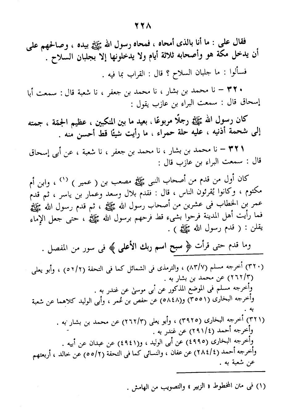 321 - نا مُحَمَّدُ بْنُ بَشَّارٍ، نا مُحَمَّدُ بْنُ جَعْفَرٍ، نا شُعْبَةُ، عَنْ أَبِي إِسْحَاقَ قَالَ: سَمِعْتُ الْبَرَاءَ بْنَ عَازِبٍ قَالَ: كَانَ §أَوَّلَ مَنْ قَدِمَ مِنْ أَصْحَابِ النَّبِيِّ صَلَّى اللهُ عَلَيْهِ وَسَلَّمَ مُصْعَبُ بْنُ عُمَيْرٍ، وَابْنُ أُمِّ مَكْتُومٍ، وَكَانُوا يُقْرِئُونَ النَّاسَ، قَالَ: فَقَدِمَ بِلَالٌ، وَسَعْدٌ، وَعَمَّارُ بْنُ يَاسِرٍ، ثُمَّ قَدِمَ عُمَرُ بْنُ الْخَطَّابِ فِي عِشْرِينَ مِنْ أَصْحَابِ رَسُولِ اللَّهِ صَلَّى اللهُ عَلَيْهِ وَسَلَّمَ، ثُمَّ قَدِمَ رَسُولُ اللَّهِ صَلَّى اللهُ عَلَيْهِ وَسَلَّمَ، فَمَا رَأَيْتُ أَهْلَ الْمَدِينَةِ فَرِحُوا بِشَيْءٍ قَطُّ فَرَحَهُمْ بِرَسُولِ اللَّهِ صَلَّى اللهُ عَلَيْهِ وَسَلَّمَ، حَتَّى جَعَلَ الْإِمَاءُ يَقُلْنَ: قَدِمَ رَسُولُ اللَّهِ صَلَّى اللهُ عَلَيْهِ وَسَلَّمَ، وَمَا قَدِمَ، حَتَّى قَرَأْتُ سَبِّحِ اسْمَ رَبِّكَ الْأَعْلَى فِي سُوَرٍ مِنَ الْمُفَصَّلِ "