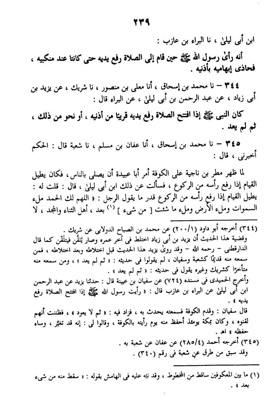 344 - نا مُحَمَّدُ بْنُ إِسْحَاقَ، أنا مُعَلَّى بْنُ مَنْصُورٍ، نا شَرِيكٌ، عَنْ يَزِيدَ بْنِ أَبِي زِيَادٍ، عَنْ عَبْدِ الرَّحْمَنِ بْنِ أَبِي لَيْلَى، عَنِ الْبَرَاءِ قَالَ: كَانَ النَّبِيُّ صَلَّى اللهُ عَلَيْهِ وَسَلَّمَ §إِذَا افْتَتَحَ الصَّلَاةَ رَفَعَ يَدَيْهِ قَرِيبًا مِنْ أُذُنَيْهِ، أَوْ نَحْوًا مِنْ ذَلِكَ، ثُمَّ لَمْ يَعُدْ "