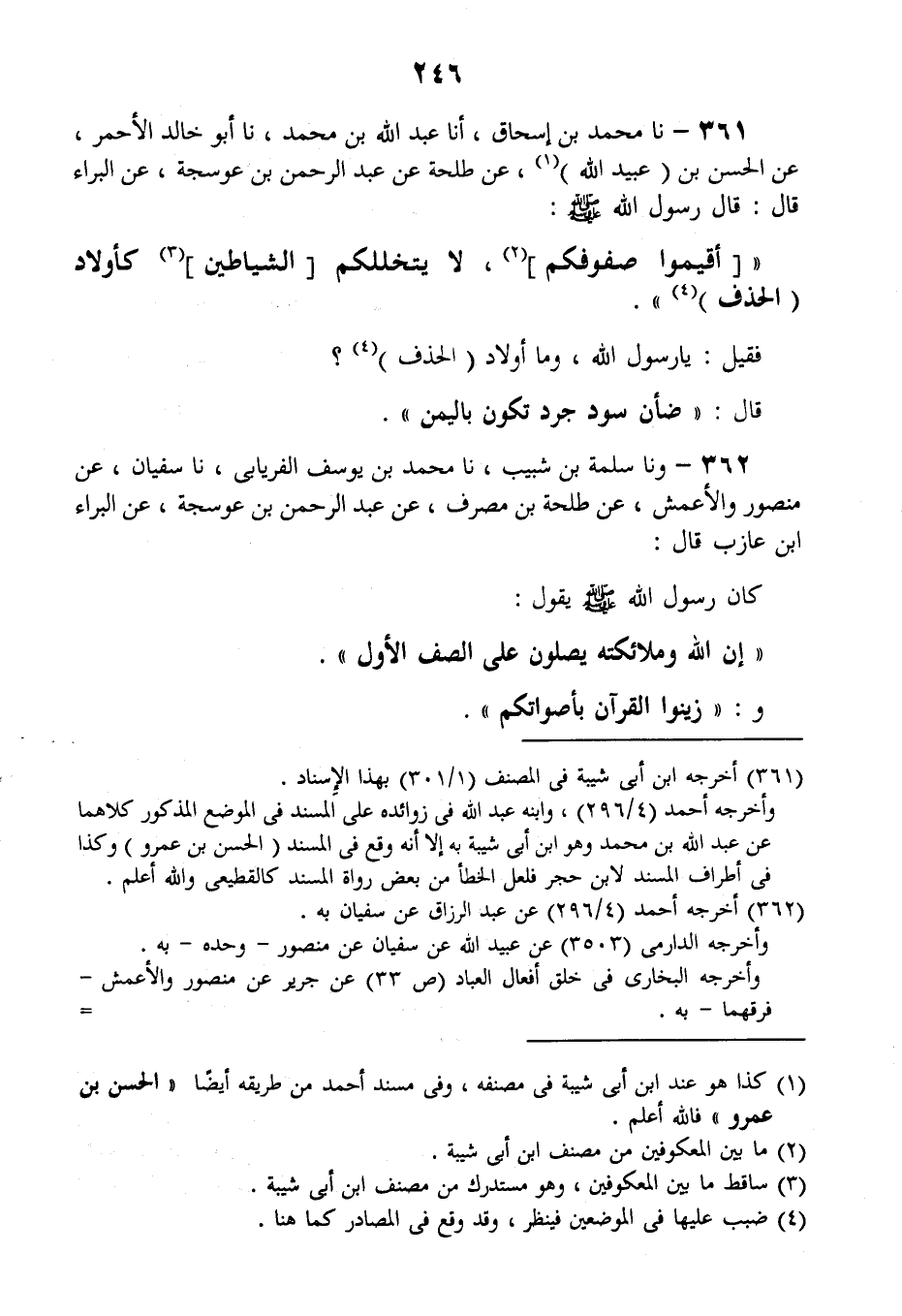 361 - نا مُحَمَّدُ بْنُ إِسْحَاقَ، أنا عَبْدُ اللَّهِ بْنُ مُحَمَّدٍ، نا أَبُو خَالِدٍ الْأَحْمَرُ، عَنِ الْحَسَنِ بْنِ عُبَيْدِ اللَّهِ، عَنْ طَلْحَةَ، عَنْ عَبْدِ الرَّحْمَنِ بْنِ عَوْسَجَةَ، عَنِ الْبَرَاءِ قَالَ: قَالَ رَسُولُ اللَّهِ صَلَّى اللهُ عَلَيْهِ وَسَلَّمَ «§أَقِيمُوا صُفُوفَكُمْ لَا يَتَخَلَّلُكُمُ الشَّيَاطِينُ كَأَوْلَادِ الْحَذْفِ» فَقِيلَ: يَا رَسُولَ اللَّهِ، وَمَا أَوْلَادُ الْحَذْفِ؟ قَالَ: «ضَأْنٌ سُودٌ جُرْدٌ تَكُونُ بِالْيَمَنِ»