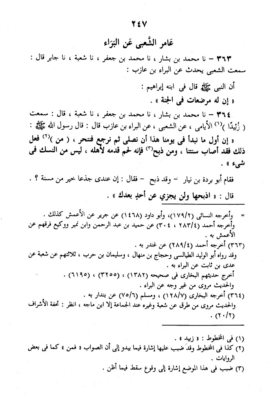 363 - نا مُحَمَّدُ بْنُ بَشَّارٍ، نا مُحَمَّدُ بْنُ جَعْفَرٍ، نا شُعْبَةُ، نا جَابِرٌ قَالَ: سَمِعْتُ الشَّعْبِيَّ يُحَدِّثُ، عَنِ الْبَرَاءِ بْنِ عَازِبٍ أَنَّ النَّبِيَّ صَلَّى اللهُ عَلَيْهِ وَسَلَّمَ قَالَ فِي ابْنِهِ إِبْرَاهِيمَ: «§إنَّ لَهُ مُرْضِعَاتٍ فِي الْجَنَّةِ»